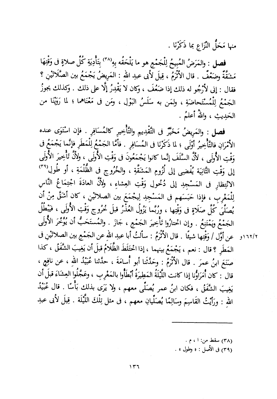 فصل: والمَرَضُ المُبِيحُ لِلْجَمْعِ هو ما يَلْحَقُه بِهِ (٣٨) بِتَأْدِيَةِ كُلِّ صلاةٍ في وَقْتِهَا مَشَقَّةٌ وضَعْفٌ. قال الأثْرَمُ، قِيلَ لأبي عبدِ اللهِ: المَرِيضُ يَجْمَعُ بين الصَّلَاتَيْنِ؟ فقال: إني لأرْجُو له ذلك إذا ضَعُفَ، وكان لا يَقْدِرُ إلَّا على ذلك. وكذلك يجوزُ الجَمْعُ لِلْمُسْتَحاضَةِ، ولمَن به سَلَسُ البَوْلِ، ومَن في مَعْنَاهما؛ لما رَوَيْنَا من الحَدِيثِ، واللهُ أعلمُ.