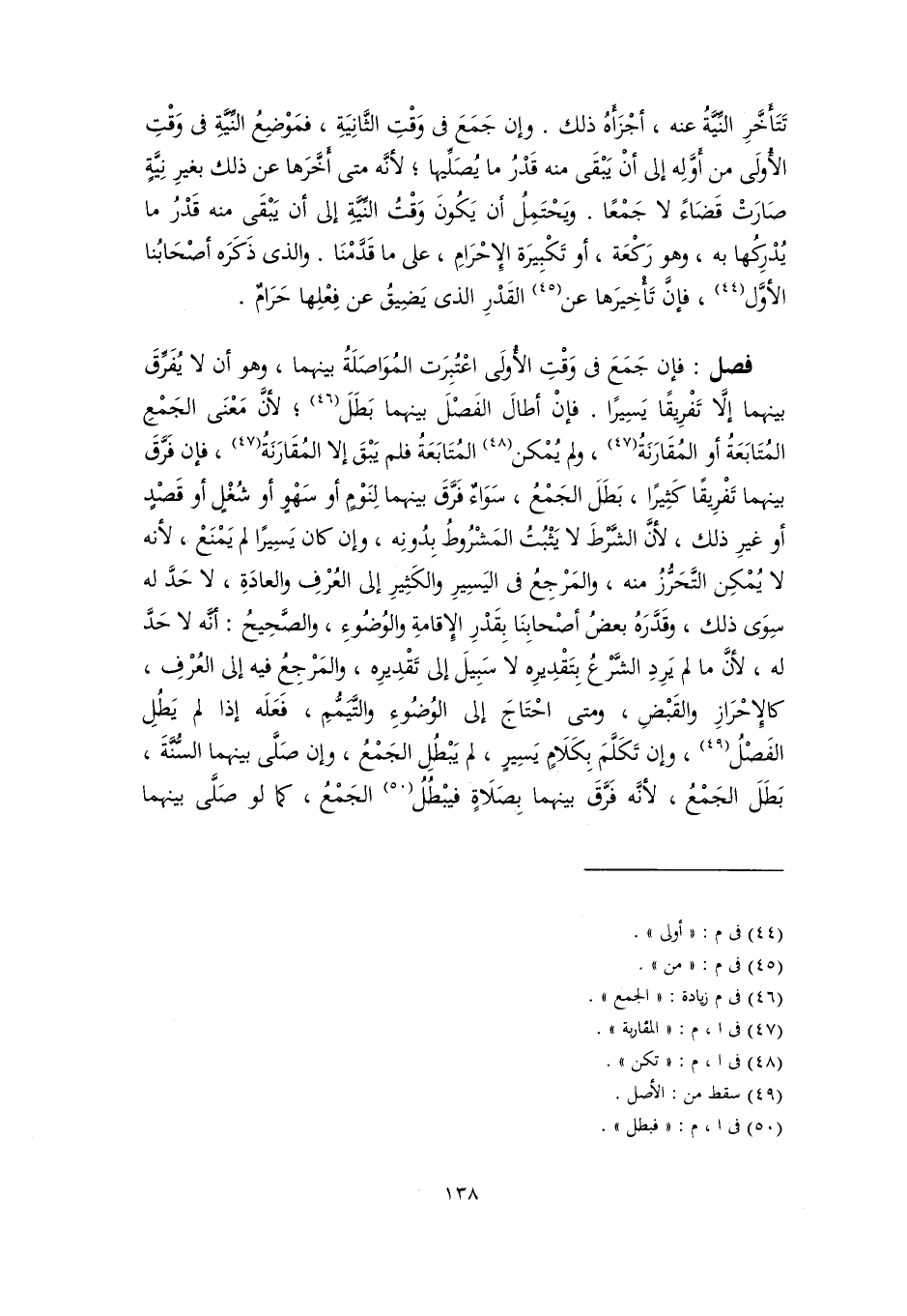 فصل: فإن جَمَعَ في وَقْتِ الأُولَى اعْتُبِرَت المُوَاصَلَةُ بينهما، وهو أن لا يُفَرِّقَ بينهما إلَّا تَفْرِيقًا يَسِيرًا. فإنْ أطالَ الفَصْلَ بينهما بَطَلَ (٤٦)؛ لأنَّ مَعْنَى الجَمْعِ المُتَابَعَةُ أو المُقَارَنَةُ (٤٧)، ولم يُمْكن (٤٨) المُتَابَعَةُ فلم يَبْقَ إلا المُقَارَنَةُ (٤٧)، فإن فَرَّقَ بينهما تَفْرِيقًا كَثِيرًا، بَطَلَ الجَمْعُ، سَوَاءٌ فَرَّقَ بينهما لِنَوْمٍ أو سَهْوٍ أو شُغْلٍ أو قَصْدٍ أو غيرِ ذلك، لأنَّ الشَّرْطَ لا يَثْبُتُ المَشْرُوطُ بِدُونِه، وإن كان يَسِيرًا لم يَمْنَعْ، لأنه لا يُمْكِن التَّحَرُّزُ منه، والمَرْجِعُ في اليَسِيرِ والكَثِيرِ إلى العُرْفِ والعادَةِ، لا حَدَّ له سِوَى ذلك، وقَدَّرَهُ بعضُ أصْحابِنَا بِقَدْرِ الإِقامةِ والوُضُوءِ، والصَّحِيحُ: أنَّه لا حَدَّ له، لأنَّ ما لم يَرِدِ الشَّرْعُ بِتَقْدِيرِه لا سَبِيلَ إلى تَقْدِيرِه، والمَرْجِعُ فيه إلى العُرْفِ، كالإِحْرَازِ والقَبْضِ، ومتى احْتَاجَ إلى الوُضُوءِ والتَّيَمُّمِ، فَعَلَه إذا لم يَطُلِ الفَصْلُ (٤٩)، وإن تَكَلَّمَ بِكَلَامٍ يَسِيرٍ، لم يَبْطُلِ الجَمْعُ، وإن صَلَّى بينهما السُّنَّةَ، بَطَلَ الجَمْعُ، لأنَّه فَرَّقَ بينهما بِصَلَاةٍ فيبْطُلُ (٥٠) الجَمْعُ، كما لو صَلَّى بينهما