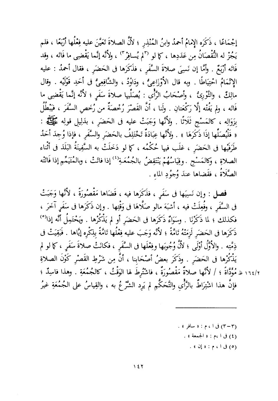 فصل: وإن نَسِيَها في سَفَرٍ، فذَكَرَها فيه، قَضَاها مَقْصُورَةً، لأنَّها وَجَبَتْ في السَّفَرِ، وفُعِلَتْ فيه، أشبَهَ ما لو صَلَّاهَا في وَقْتِها. وإن ذَكَرَها في سَفَرٍ آخَرَ، فكذلك؛ لما ذَكَرْنَا. وسَوَاءٌ ذَكَرَها في الحَضَرِ أو لم يَذْكُرْها. ويَحْتَمِلُ أنَّه إذا (٥) ذَكَرَها في الحَضَرِ لَزِمَتْهُ تَامَّةً؛ لأنَّه وَجَبَ عليه فِعْلُها تَامَّةً بِذِكْرِه إيَّاها. فَبَقِيَتْ في ذِمَّتِه. والأوَّلُ أوْلَى؛ لأنَّ وُجُوبَها وفِعْلَها في السَّفَرِ، فكانَتْ صلاةَ سَفَرٍ، كما لو لم يَذْكُرْها في الحَضَرِ. وذَكَرَ بعضُ أصْحَابِنا، أنَّ مِن شَرْطِ القَصْرِ كَوْنَ الصلاةِ مُؤَدَّاةً؛ لأنَّها صلاةٌ مَقْصُورَةٌ، فاشْتُرِطَ لها الوَقْتُ، كالجُمُعَةِ. وهذا فاسِدٌ؛ فإنَّ هذا اشْتِرَاطٌ بالرَّأْىِ والتَّحَكُّمِ لم يَرِد الشَّرْعُ به، والقِياسُ على الجُمُعَةِ غيرُ