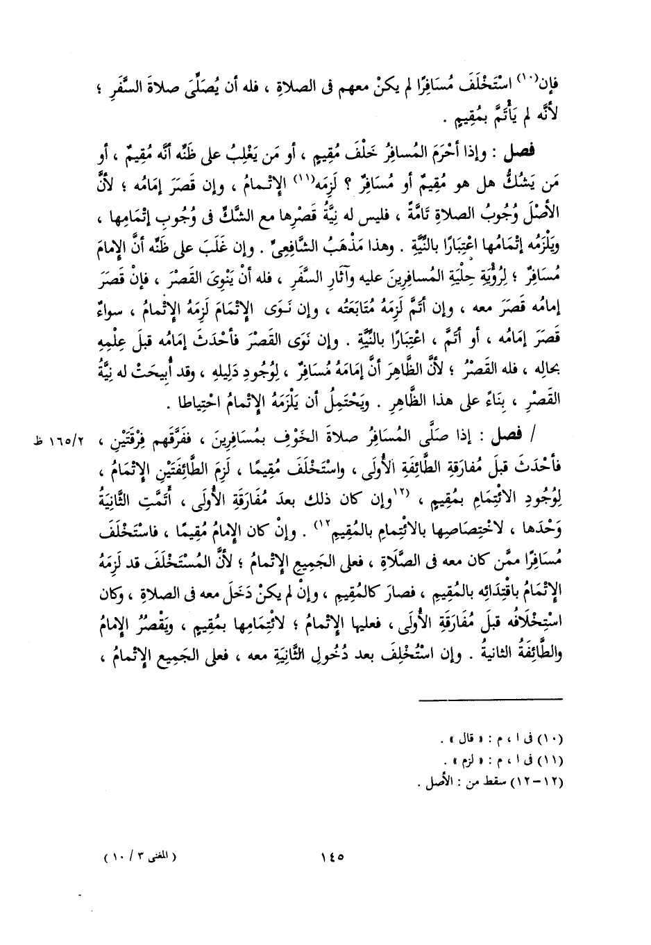 فصل: وإذا أحْرَمَ المُسافِرُ خَلْفَ مُقِيمٍ، أو مَن يَغْلِبُ على ظَنِّه أنَّه مُقِيمٌ، أو مَن يَشُكُّ هل هو مُقِيمٌ أو مُسَافِرٌ؟ لَزِمَه (١١) الإِتْمامُ، وإن قَصَرَ إمَامُه؛ لأنَّ الأصْلَ وُجُوبُ الصلاةِ تَامَّةً، فليس له نِيَّةُ قَصْرِها مع الشَّكِّ في وُجُوبِ إتْمَامِها، ويَلْزَمُه إتْمَامُها اعْتِبَارًا بالنِّيَّةِ. وهذا مَذْهَبُ الشَّافِعِىِّ. وإن غَلَبَ على ظَنِّه أنَّ الإِمامَ مُسَافِرٌ؛ لِرُؤْيَةِ حِلْيَةِ المُسافِرِينَ عليه وآثَارِ السَّفَرِ، فله أنْ يَنْوِىَ القَصْرَ، فإنْ قَصَرَ إمامُه قَصَرَ معه، وإن أتَمَّ لَزِمَهُ مُتَابَعَتُه، وإن نَوَى الإِتْمَامَ لَزِمَهُ الإِتْمامُ، سواءٌ قَصَرَ إمَامُه، أو أتَمَّ، اعْتِبَارًا بالنِّيَّةِ. وإن نَوَى القَصْرَ فأحْدَثَ إمَامُه قبلَ عِلْمِهِ بحالِه، فله القَصْرُ؛ لأنَّ الظَّاهِرَ أنَّ إمَامَهُ مُسَافِرٌ، لِوُجُودِ دَلِيلهِ، وقد أُبِيحَتْ له نِيَّةُ القَصْرِ، بِنَاءً على هذا الظَّاهِرِ. ويَحْتَمِلُ أن يَلْزَمَهُ الإِتْمامُ احْتِياطا.