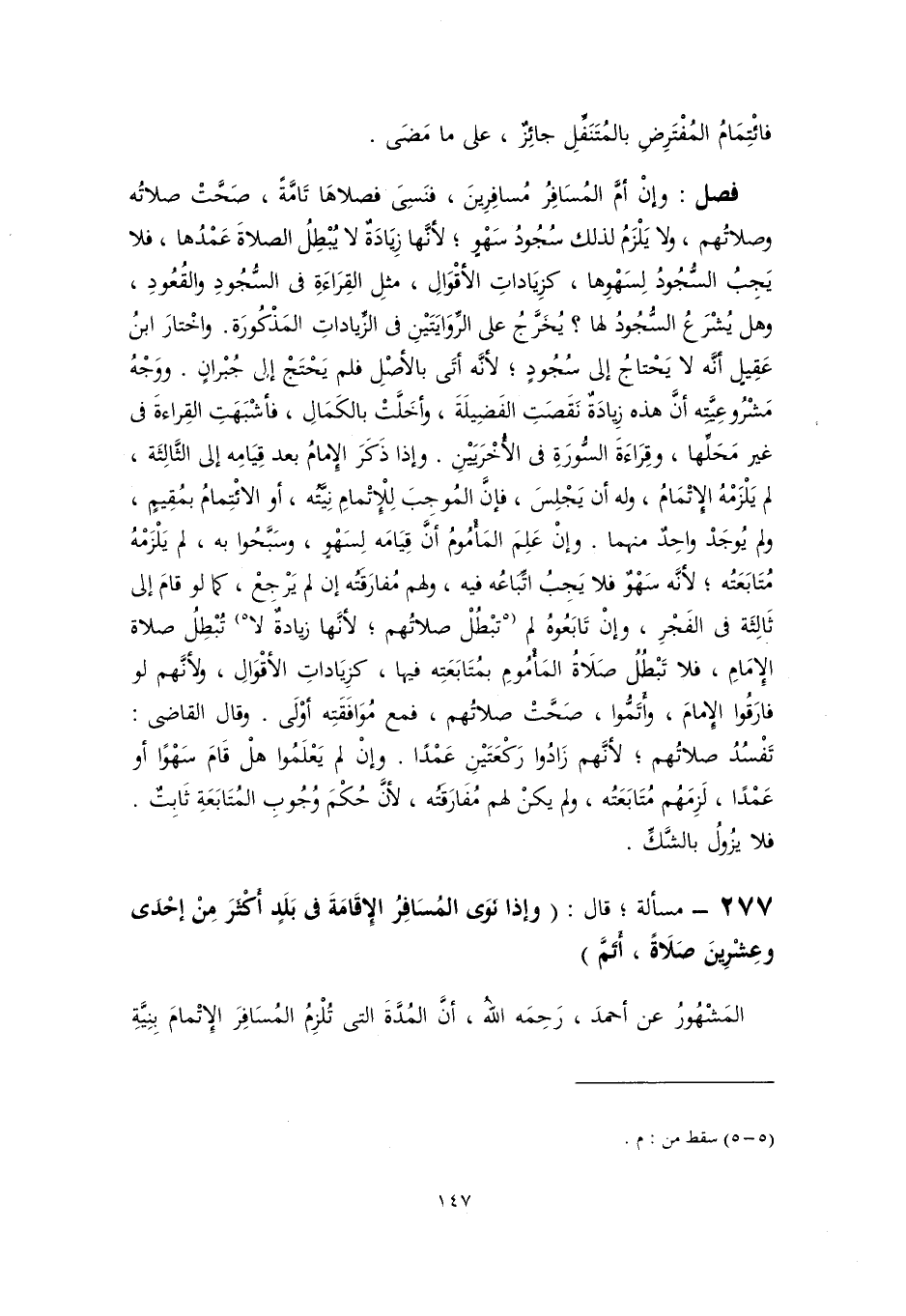 فصل: وإنْ أمَّ المُسَافِرُ مُسافِرِينَ، فنَسِىَ فصلاهَا تَامَّةً، صَحَّتْ صلاتُه وصلاتُهم، ولا يَلْزَمُ لذلك سُجُودُ سَهْوٍ؛ لأنَّها زِيَادَةٌ لا يُبْطِلُ الصلاةَ عَمْدُها، فلا يَجِبُ السُّجُودُ لِسَهْوِها، كزِيَاداتِ الأقْوَالِ، مثلِ القِرَاءَةِ في السُّجُودِ والقُعُودِ، وهل يُشْرَعُ السُّجُودُ لها؟ يُخَرَّجُ على الرِّوَايَتَيْنِ في الزِّياداتِ المَذْكُورَة. واخْتارَ ابنُ عَقِيلٍ أَنَّه لا يَحْتاجُ إلى سُجُودٍ؛ لأنَّه أتَى بالأصْلِ فلم يَحْتَجْ إلى جُبْرانٍ. ووَجْهُ مَشْرُوعِيَّتِه أنَّ هذه زِيادَةٌ نَقَصَتِ الفَضِيلَةَ، وأخَلَّتْ بالكَمَالِ، فأشْبَهَتِ القِراءةَ في غير مَحَلِّها، وقِرَاءَةَ السُّورَةِ في الأُخْرَيَيْنِ. وإذا ذَكَرَ الإِمامُ بعد قِيَامِه إلى الثَّالِثَة، لم يَلْزَمْهُ الإِتْمَامُ، وله أن يَجْلِسَ، فإنَّ المُوجبَ لِلْإِتْمامِ نِيَّتُه، أو الائْتِمامُ بمُقِيمٍ، ولم يُوجَدْ واحِدٌ منهما. وإنْ عَلِمَ المَأْمُومُ أنَّ قِيَامَه لِسَهْوٍ، وسَبَّحُوا به، لم يَلْزَمْهُ مُتَابَعَتُه؛ لأنَّه سَهْوٌ فلا يَجِبُ اتِّبَاعُه فيه، ولهم مُفارَقَتُه إن لم يَرْجِعْ، كما لو قامَ إلى ثَالِثَة في الفَجْرِ، وإنْ تَابَعُوهُ لم [تبْطُلْ صلاتُهم؛ لأنَّها زيادةٌ لا] (٥) تُبْطِلُ صلاة الإِمَامِ، فلا تَبْطُلُ صَلَاةُ المَأْمُومِ بمُتَابَعَتِه فيها، كزِيَاداتِ الأقْوَالِ، ولأنَّهم لو فارَقُوا الإِمامَ، وأَتَمُّوا، صَحَّتْ صلاتُهم، فمع مُوَافَقَتِه أوْلَى. وقال القاضي: تَفْسُدُ صلاتُهم؛ لأنَّهم زَادُوا رَكْعَتَيْنِ عَمْدًا. وإنْ لم يَعْلَمُوا هلْ قَامَ سَهْوًا أو عَمْدًا، لَزِمَهُم مُتَابَعَتُه، ولم يكنْ لهم مُفَارَقَتُه، لأنَّ حُكْمَ وُجُوبِ المُتَابَعَةِ ثَابِتٌ. فلا يزُولُ بالشَّكِّ.