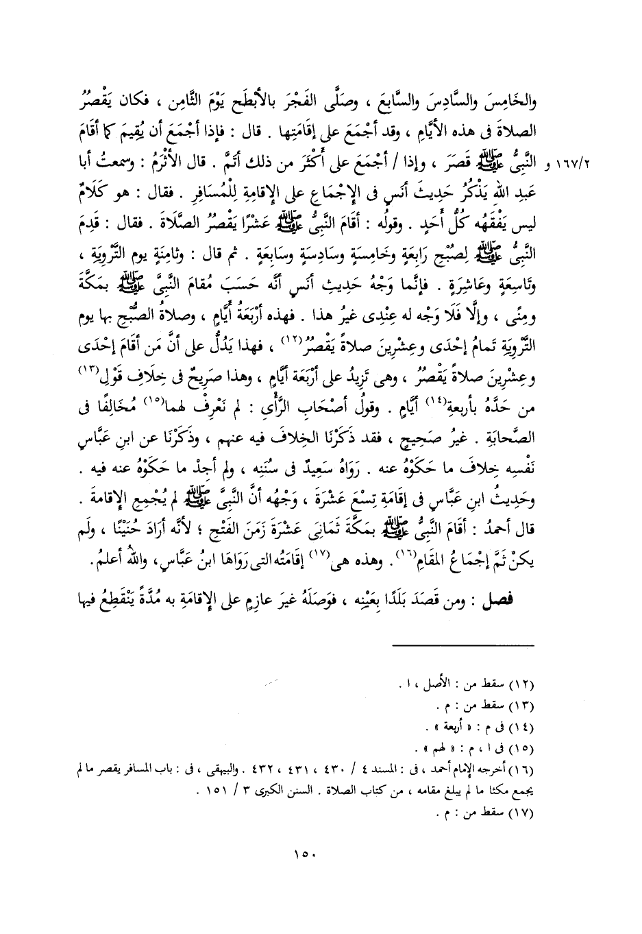 والخَامِسَ والسَّادِسَ والسَّابِعَ، وصَلَّى الفَجْرَ بالأبْطَح يَوْمَ الثَّامِن، فكان يَقْصُرُ الصلاةَ في هذه الأيَّامِ، وقد أجْمَعَ على إقَامَتِها. قال: فإِذا أجْمَعَ أن يُقِيمَ كما أقَامَ النَّبِىُّ -صلى اللَّه عليه وسلم- قَصَرَ، وإذا أجْمَعَ على أَكْثَرَ من ذلك أتَمَّ. قال الأَثْرَمُ: وسمعتُ أبا عَبدِ اللهِ يَذْكُرُ حَدِيثَ أنَسٍ في الإِجْمَاعِ على الإقامَةِ لِلْمُسَافِرِ. فقال: هو كَلَامٌ ليس يَفْقَهُه كُلُّ أَحَدٍ. وقولُه: أقَامَ النَّبِىُّ -صلى اللَّه عليه وسلم- عَشْرًا يَقْصُرُ الصَّلَاةَ. فقال: قَدِمَ النَّبِىُّ -صلى اللَّه عليه وسلم- لِصُبْحِ رَابِعَةٍ وخَامِسَةٍ وسَادِسَةٍ وسَابِعَةٍ. ثم قال: وثامِنَةٍ يوم التَّرْوِيَةِ، وتَاسِعَةٍ وعَاشِرَةٍ. فإنَّما وَجْهُ حَدِيثِ أنَسٍ أنَّه حَسَبَ مُقامَ النَّبِىَّ -صلى اللَّه عليه وسلم- بمَكَّةَ ومِنًى، وإلَّا فَلَا وَجْه له عِنْدِى غيرُ هذا. فهذه أرْبَعَةُ أَيَّامٍ، وصلاةُ الصُّبْحِ بها يوم التَّرْوِيَةِ تَمامُ إحْدَى وعِشْرِينَ صلاةً يَقْصُرُ (١٢)، فهذا يَدُلُّ على أنَّ مَن أقَامَ إحْدَى وعِشْرِينَ صلاةً يَقْصُرُ، وهى تَزِيدُ على أرْبَعَة أيَّامٍ، وهذا صَرِيحٌ في خِلَافِ قَوْلِ (١٣) من حَدَّهُ بأربعةِ (١٤) أيَّامٍ. وقولُ أصْحَابِ الرَّأْىِ: لم نَعْرِفْ لهما (١٥) مُخَالِفًا في الصَّحابَةِ. غيرُ صَحِيحٍ، فقد ذَكَرْنَا الخِلافَ فيه عنهم، وذَكَرْنَا عن ابنِ عَبَّاسٍ نَفْسِه خِلافَ ما حَكَوْهُ عنه. رَوَاهُ سَعِيدٌ في سُنَنِه، ولم أجِدْ ما حَكَوْهُ عنه فيه. وحَدِيثُ ابنِ عَبَّاسٍ في إقَامَةِ تِسْعَ عَشْرَةَ، وَجْهُه أنَّ النَّبِىَّ -صلى اللَّه عليه وسلم- لم يُجْمِعِ الإِقامةَ. قال أحمدُ: أقَامَ النَّبِىُّ -صلى اللَّه عليه وسلم- بمَكَّةَ ثَمَانِىَ عَشْرَةَ زَمَنَ الفَتْحِ؛ لأنَّه أرَادَ حُنَيْنًا، ولَم يكنْ ثَمَّ إجْمَاعُ المقَامِ (١٦). وهذه هي (١٧) إقَامَتُه التي رَوَاهَا ابنُ عَبَّاسٍ، واللهُ أعلمُ.