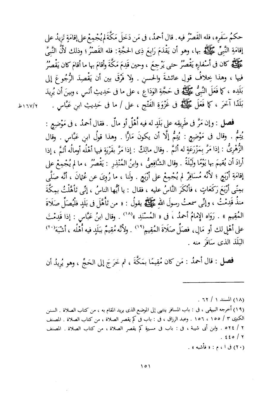 فصل: وإن مَرَّ في طَرِيقِه على بَلَدٍ له فيه أَهْلٌ أو مالٌ. فقال أحمدُ، في مَوْضِعٍ: يُتِمُّ. وقال في مَوْضِعٍ: يُتِمُّ إلَّا أن يكونَ مَارًّا. وهذا قولُ ابنِ عَبَّاسٍ. وقال الزُّهْرِىُّ: إذا مَرَّ بِمَزْرَعَةٍ له أتَمَّ. وقال مالِكٌ: إذا مَرَّ بقَرْيَةٍ فيها أهْلُه أو مالُه أتَمَّ، إذا أرادَ أن يُقيمَ بها يَوْمًا ولَيْلَةً. وقال الشَّافِعِىُّ، وابنُ المُنْذِرِ: يَقْصُرُ، ما لم يُجْمِعْ على إقامَةِ أرْبَعٍ؛ لأنَّه مُسَافِرٌ لم يُجْمِعْ على أرْبَعٍ. ولَنا، ما رُوِىَ عن عُثمانَ، أنَّه صَلَّى بمِنًى أرْبَعَ رَكَعَاتٍ، فأنْكَرَ النَّاسُ عليه، فقال: يا أيُّها الناسُ، إنِّي تَأهَّلْتُ بمَكَّةَ منذُ قَدِمْتُ، وإنِّى سمعتُ رسولَ اللهِ -صلى اللَّه عليه وسلم- يقولُ: "من تَأَهَّلَ في بَلَدٍ فلْيُصَلِّ صَلَاةَ المُقِيمِ". رَوَاه الإِمامُ أحمدُ، في "المُسْنَدِ" (١٨). وقال ابنُ عَبَّاسٍ: إذا قَدِمْتَ على أهْلٍ لك أو مَالٍ، فصَلِّ صَلَاةَ المُقِيمِ (١٩). ولأنَّه مُقِيمٌ ببَلَدٍ فيه أَهْلُه، أشْبَهَ (٢٠) البَلَدَ الذي سَافَرَ منه.