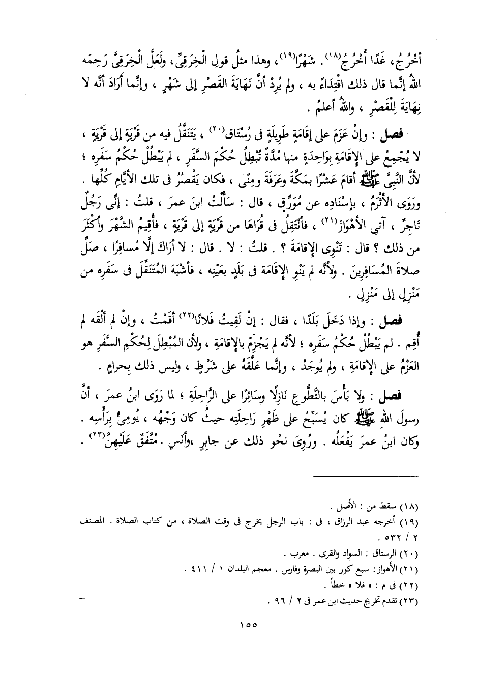 أخْرُجُ، غَدًا أَخرُجُ (١٨). شَهْرًا (١٩)، وهذا مثلُ قولِ الْخِرَقِيِّ، ولَعَلَّ الْخِرَقِيَّ رَحِمَه اللهُ إنَّما قال ذلك اقْتِدَاءً به، ولم يُرِدْ أنَّ نَهَايَةَ القَصْرِ إلى شَهْرٍ، وإنَّما أرَادَ أنَّه لا نِهَايَةَ لِلْقَصْرِ، واللهُ أعلمُ.