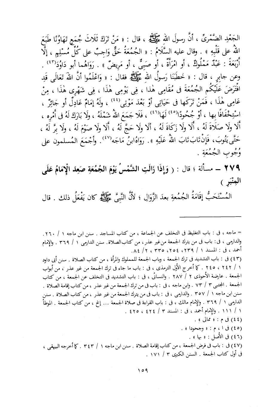 الجَعْدِ الضَّمْرىِّ، أنَّ رسولَ اللهِ -صلى اللَّه عليه وسلم-، قال: "مَنْ تَرَكَ ثَلَاثَ جُمَعٍ تَهَاوُنًا طَبَعَ اللهُ على قَلْبِهِ". وقال عليه السَّلَامُ: "الجُمُعَةُ حَقٌّ وَاجِبٌ على كُلِّ مُسْلِمٍ، إلَّا أَرْبَعَةً: عَبْدٌ مَمْلُوكٌ، أو امْرَأَةٌ، أو صَبِيٌّ، أو مَرِيضٌ". رَوَاهُما أبو دَاوُدَ (٤٣). وعن جابِرٍ، قال: "خَطَبَنَا رَسولُ اللهِ -صلى اللَّه عليه وسلم- فقال: "وَاعْلَمُوا أنَّ اللَّه تَعَالَى قَدِ افْتَرَضَ عَلَيْكُم الجُمُعَةَ في مُقَامِي هذا، في يَوْمِي هذَا، فِي شَهْرِى هذَا، مِنْ عَامِي هذَا، فَمَنْ تَرَكَها في حَيَاتِى أوْ بَعْدَ مَوْتِى (٤٤)، ولَهُ إمَامٌ عَادِلٌ أو جَائِرٌ، أسْتِخْفَافًا بِها، أوْ جُحُودًا (٤٥) لَهَا (٤٦)، فَلَا جَمَعَ اللهُ شَمْلَهُ، ولَا بَارَكَ لَهُ في أَمْرِه، أَلَا ولَا صَلَاةَ لَهُ، ألَا ولَا زَكَاةَ لَهُ، ألَا ولَا حَجَ لَهُ، أَلَا ولَا صَوْمَ لَهُ، ولَا بِرَّ لَهُ، حَتَّى يَتُوبَ، فَإنْ تَابَ تَابَ اللهُ عَلَيْهِ". رَوَاهُ ابنُ مَاجَه (٤٧). وأجْمَعَ المُسلمون على وُجُوبِ الجُمُعَةِ.