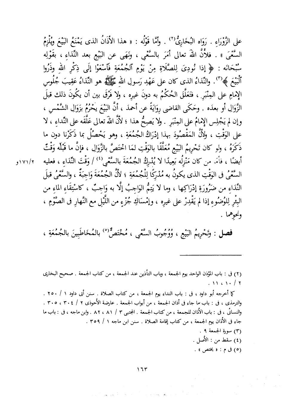 على الزَّوْرَاءِ. رَوَاه البُخَارِيُّ (٢). وأمَّا قَوْلُه: "هذا الأذَانُ الذي يَمْنَعُ البَيْعَ ويُلْزِمُ السَّعْىَ". فلأَنَّ اللهَ تعالى أمَرَ بالسَّعْىِ، ونَهَى عن البَيْعِ بعد النِّدَاءِ، بقَوْلِه سُبْحَانَه: {إِذَا نُودِيَ لِلصَّلَاةِ مِنْ يَوْمِ الْجُمُعَةِ فَاسْعَوْا إِلَى ذِكْرِ اللَّهِ وَذَرُوا الْبَيْعَ} (٣). والنِّدَاءُ الذي كان على عَهْدِ رَسولِ اللهِ -صلى اللَّه عليه وسلم- هو النِّدَاءُ عَقِيبَ جُلُوسِ الإِمامِ على المِنْبَرِ، فتَعَلَّقَ الحُكْمُ به دونَ غيرِه، ولا فَرْقَ بين أن يكُونَ ذلك قبلَ الزَّوَالِ أو بعدَه. وحَكَى القاضي رِوَايَةً عن أحمدَ، أنَّ البَيْعَ يحْرُمُ بزَوَالِ الشَّمْسِ، وإن لم يَجْلِس الإِمامُ على المِنْبَرِ. ولا يَصِحُّ هذا؛ لأنَّ اللهَ تعالى عَلَّقَه على النِّداءِ، لا على الوَقْتِ، ولأنَّ المَقْصُودَ بهذا إدْرَاكُ الجُمُعَةِ، وهو يَحْصُلُ بما ذَكَرْنا دون ما ذَكَرَهُ، ولو كان تَحْرِيمُ البَيْعِ مُعَلَّقًا بالوَقْتِ لمَا اخْتَصَّ بالزَّوَالِ، فإنَّ ما قَبْلَه وَقْتٌ أيضًا، فأمَّا من كان مَنْزِلُه بَعِيدًا لا يُدْرِكُ الجُمُعَةَ بالسَّعْىِ (٤) وَقْتَ النِّدَاءِ، فعليه السَّعْيُ في الوَقْتِ الذي يكونُ به مُدْرِكًا لِلْجُمُعَةِ؛ لأنَّ الجُمُعَةَ وَاجِبَةٌ، والسَّعْيُ قبلَ النِّدَاءِ من ضَرُورَةِ إدْرَاكِها، وما لا يَتِمُّ الوَاجِبُ إلَّا به وَاجِبٌ، كاسْتِقَاءِ الماءِ من البِئْرِ لِلوُضُوءِ إذا لم يَقْدِرْ على غيرِه، وإمْسَاكِ جُزْءٍ من اللَّيْلِ مع النَّهارِ في الصَّوْمِ، ونحوِهما.