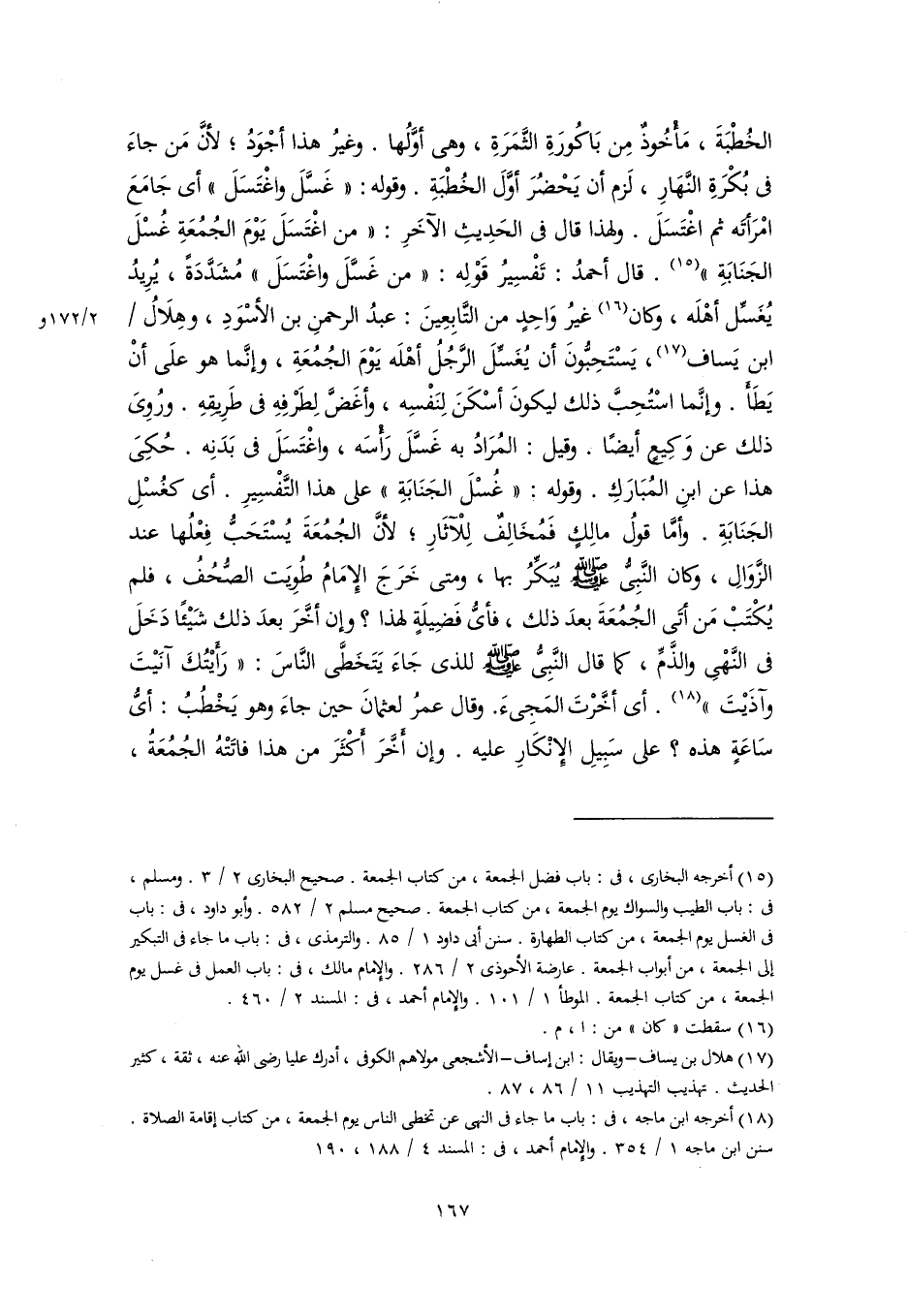 (١٥) أخرجه البخاري، في: باب فضل الجمعة، من كتاب الجمعة. صحيح البخاري ٢/ ٣. ومسلم، في: باب الطيب والسواك يوم الجمعة، من كتاب الجمعة. صحيح مسلم ٢/ ٥٨٢. وأبو داود، في: باب في الغسل يوم الجمعة، من كتاب الطهارة. سنن أبي داود ١/ ٨٥. والترمذي، في: باب ما جاء في التبكير إلى الجمعة، من أبواب الجمعة. عارضة الأحوذى ٢/ ٢٨٦. والإِمام مالك، في: باب العمل في غسل يوم الجمعة، من كتاب الجمعة. الموطأ ١/ ١٠١. والإِمام أحمد، في: المسند ٢/ ٤٦٠.