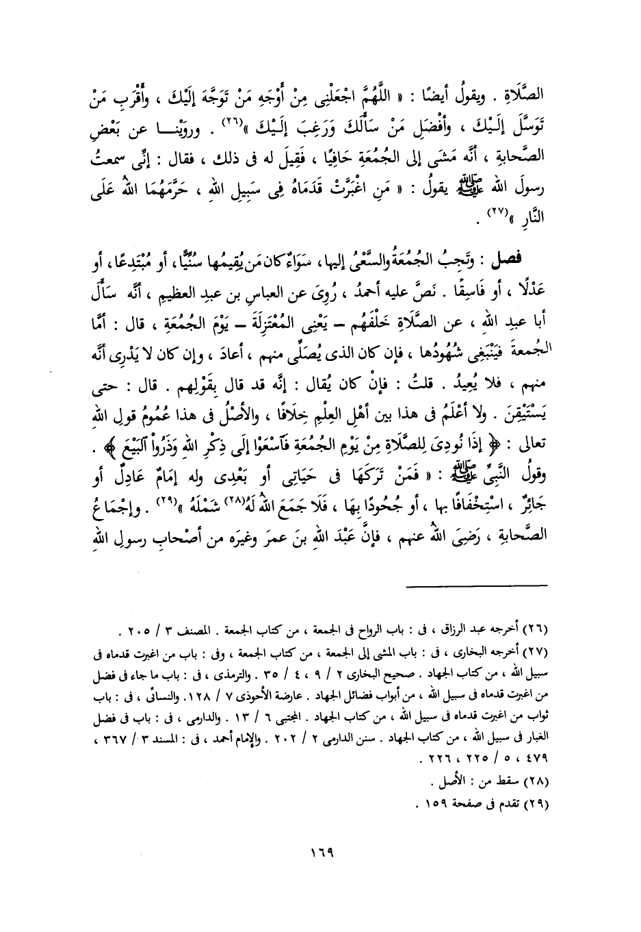 الصَّلَاةِ. ويقولُ أيضًا: "اللَّهُمَّ اجْعَلْنِى مِنْ أَوْجَهِ مَنْ تَوَجَّهَ إلَيْكَ، وأَقْرَبِ مَنْ تَوَسَّلَ إلَيْكَ، وأفْضَلِ مَنْ سَأَلَكَ وَرَغِبَ إلَيْكَ" (٢٦). وروَيْنا عن بَعْضِ الصَّحابةِ، أنَّه مَشَى إلى الجُمُعَةِ حَافِيًا، فَقِيلَ له في ذلك، فقال: إنِّي سمعتُ رسولَ اللَّه -صلى اللَّه عليه وسلم- يقولُ: "مَنِ اغْبَرَّتْ قَدَمَاهُ في سَبِيلِ اللهِ، حَرَّمَهُمَا اللهُ عَلَى النَّارِ" (٢٧).