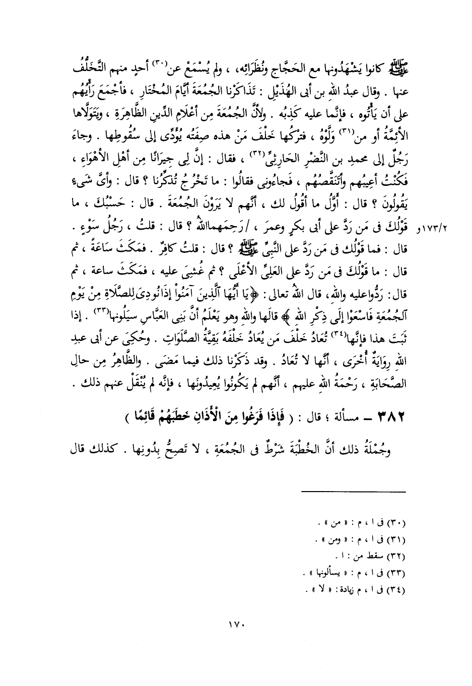-صلى اللَّه عليه وسلم- كانوا يَشْهَدُونها مع الحَجَّاج ونُظَرَائِه، ، ولم يُسْمَعْ عن (٣٠) أحدٍ منهم التَّخَلُّفُ عنها. وقال عبدُ اللهِ بن أبي الهُذَيْلِ: تَذَاكَرْنا الجُمُعَةَ أيَّامَ المُخْتَارِ، فأجْمَعَ رَأْيُهُم على أن يَأْتُوه، فإنَّما عليه كَذِبُه. ولأنَّ الجُمُعَةَ مِن أعْلَامِ الدِّينِ الظَّاهِرَةِ، ويَتَوَلَّاها الأئِمَّةُ أو من (٣١) وَلَّوْهُ، فترْكُها خَلْفَ مَنْ هذه صِفَتُه يُؤَدِّى إلى سُقُوطِها. وجاءَ رَجُلٌ إلى محمدِ بن النَّضْرِ الحَارِثِيِّ (٣٢)، فقال: إنَّ لِى جِيرَانًا مِن أهْلِ الأهْوَاءِ، فَكُنْتُ أعِيبُهم وأتَنَقَّصُهُم، فَجاءُونى فقالُوا: ما تَخْرُجُ تُذكِّرُنا؟ قال: وأيَّ شَيءٍ يَقُولُونَ؟ قال: أَوَّلُ ما أقُولُ لك، أنَّهم لا يَرَوْنَ الجُمُعَةَ. قال: حَسْبُكَ، ما قَوْلُكَ في مَن رَدَّ على أبى بكرٍ وعمرَ، رَحِمَهما اللهُ؟ قال: قلتُ، رَجُلُ سَوْءٍ. قال: فما قَوْلُك في مَن رَدَّ على النَّبِيِّ -صلى اللَّه عليه وسلم-؟ قال: قلتُ كافِرٌ. فمَكَثَ سَاعَةً، ثم قال: ما قَوْلُكَ في مَن رَدَّ على العَلِيِّ الأعْلَى؟ ثم غُشِىَ عليه، فمَكَثَ ساعة، ثم قال: رَدُّوا عليه واللهِ، قال اللهُ تعالى: {يَاأَيُّهَا الَّذِينَ آمَنُوا إِذَا نُودِيَ لِلصَّلَاةِ مِنْ يَوْمِ الْجُمُعَةِ فَاسْعَوْا إِلَى ذِكْرِ اللَّهِ} قالَها واللهِ وهو يَعْلَمُ أنَّ بَنِى العَبَّاسِ سيَلُونها (٣٣). إذا ثَبَتَ هذا فإنَّها (٣٤) تُعَادُ خَلْفَ مَن يُعَادُ خَلْفَهُ بَقِيَّةُ الصَّلَوَاتِ. وحُكِىَ عن أبي عبدِ اللهِ رِوَايَةٌ أُخْرَى، أنَّها لا تُعَادُ. وقد ذَكَرْنا ذلك فيما مَضَى. والظَّاهِرُ مِن حالِ الصَّحَابَةِ، رَحْمَةُ اللهِ عليهم، أنَّهم لم يَكُونُوا يُعِيدُونَها، فإنَّه لم يُنْقَلْ عنهم ذلك.