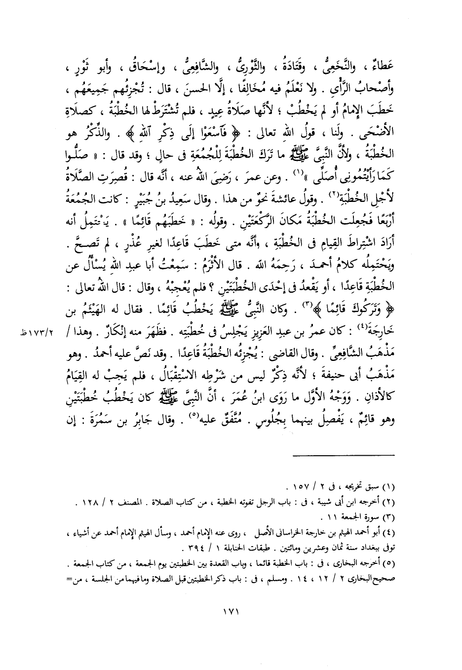 (٥) أخرجه البخاري، في: باب الخطبة قائما، وباب القعدة بين الخطبتين يوم الجمعة، من كتاب الجمعة. صحيح البخاري ٢/ ١٢، ١٤. ومسلم، في: باب ذكر الخطبتين قبل الصلاة وما فيهما من الجلسة، من =
