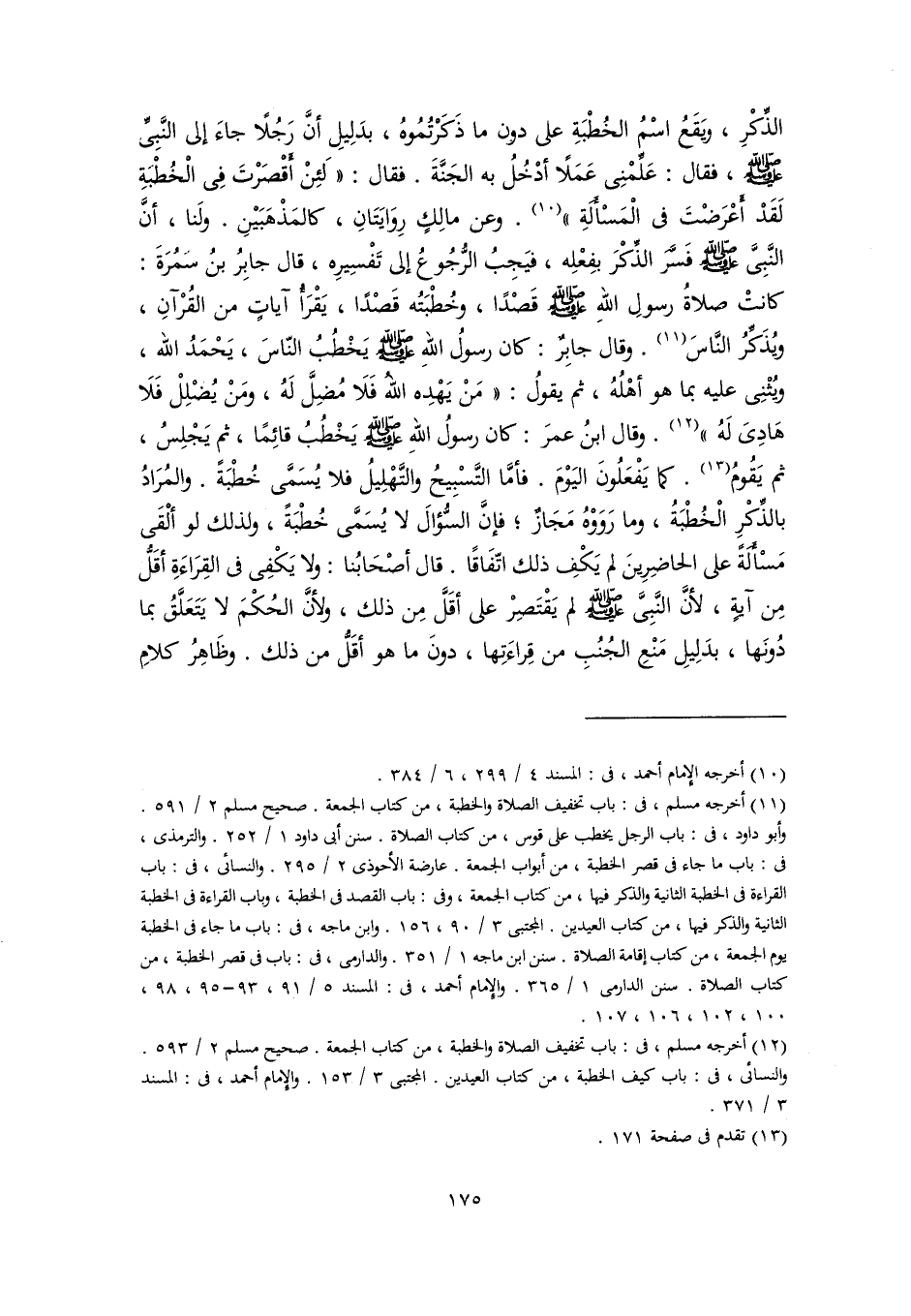 الذِّكْرِ، ويَقَعُ اسْمُ الخُطْبَةِ على دون ما ذَكَرْتُمُوهُ، بدَلِيلِ أنَّ رَجُلًا جاءَ إلى النَّبِيِّ -صلى اللَّه عليه وسلم-، فقال: عَلِّمْنِى عَمَلًا أدْخُلُ به الجَنَّةَ. فقال: "لَئِنْ أَقْصَرْتَ فِي الْخُطْبَةِ لَقَدْ أَعْرَضْتَ في الْمَسْأَلَةِ" (١٠). وعن مالِكٍ رِوَايَتَانِ، كالمَذْهَبَيْنِ. ولَنا، أنَّ النَّبِيَّ -صلى اللَّه عليه وسلم- فَسَّرَ الذِّكْرَ بفِعْلِه، فيَجِبُ الرُّجُوعُ إلى تَفْسِيرِه، قال جابِرُ بنُ سَمُرَةَ: كانتْ صلاةُ رسولِ اللهِ -صلى اللَّه عليه وسلم- قَصْدًا، وخُطْبَتُه قَصْدًا، يَقْرَأُ آياتٍ من القُرْآنِ، ويُذَكِّرُ النَّاسَ (١١). وقال جابِرٌ: كان رسولُ اللهِ -صلى اللَّه عليه وسلم- يَخْطُبُ النّاسَ، يَحْمَدُ اللَّه، ويُثْنِى عليه بما هو أهْلُهُ، ثم يقولُ: "مَنْ يَهْدِه اللهُ فَلَا مُضِلَّ لَهُ، ومَنْ يُضْلِلْ فَلَا هَادِىَ لَهُ" (١٢). وقال ابنُ عمرَ: كان رسولُ اللهِ -صلى اللَّه عليه وسلم- يَخْطُبُ قائِمًا، ثم يَجْلِسُ، ثم يَقُومُ (١٣). كما يَفْعَلُونَ اليَوْمَ. فأمَّا التَّسْبِيحُ والتَّهْلِيلُ فلا يُسَمَّى خُطْبَةً. والمُرَادُ بالذِّكْرِ الْخُطْبَةُ، وما رَوَوْهُ مَجَازٌ؛ فإنَّ السُّؤالَ لا يُسَمَّى خُطْبَةً، ولذلك لو ألْقَى مَسْأَلَةً على الحاضِرِينَ لم يَكْفِ ذلك اتّفَاقًا. قال أصْحَابُنا: ولا يَكْفِى في القِرَاءَةِ أقَلُّ مِن آيةٍ، لأنَّ النَّبِيَّ -صلى اللَّه عليه وسلم- لم يَقْتَصِرْ على أقَلَّ مِن ذلك، ولأنَّ الحُكْمَ لا يَتَعَلَّقُ بما دُونَها، بدَلِيلِ مَنْعِ الجُنُبِ من قِراءَتِها، دونَ ما هو أقَلُّ من ذلك. وظَاهِرُ كلامِ