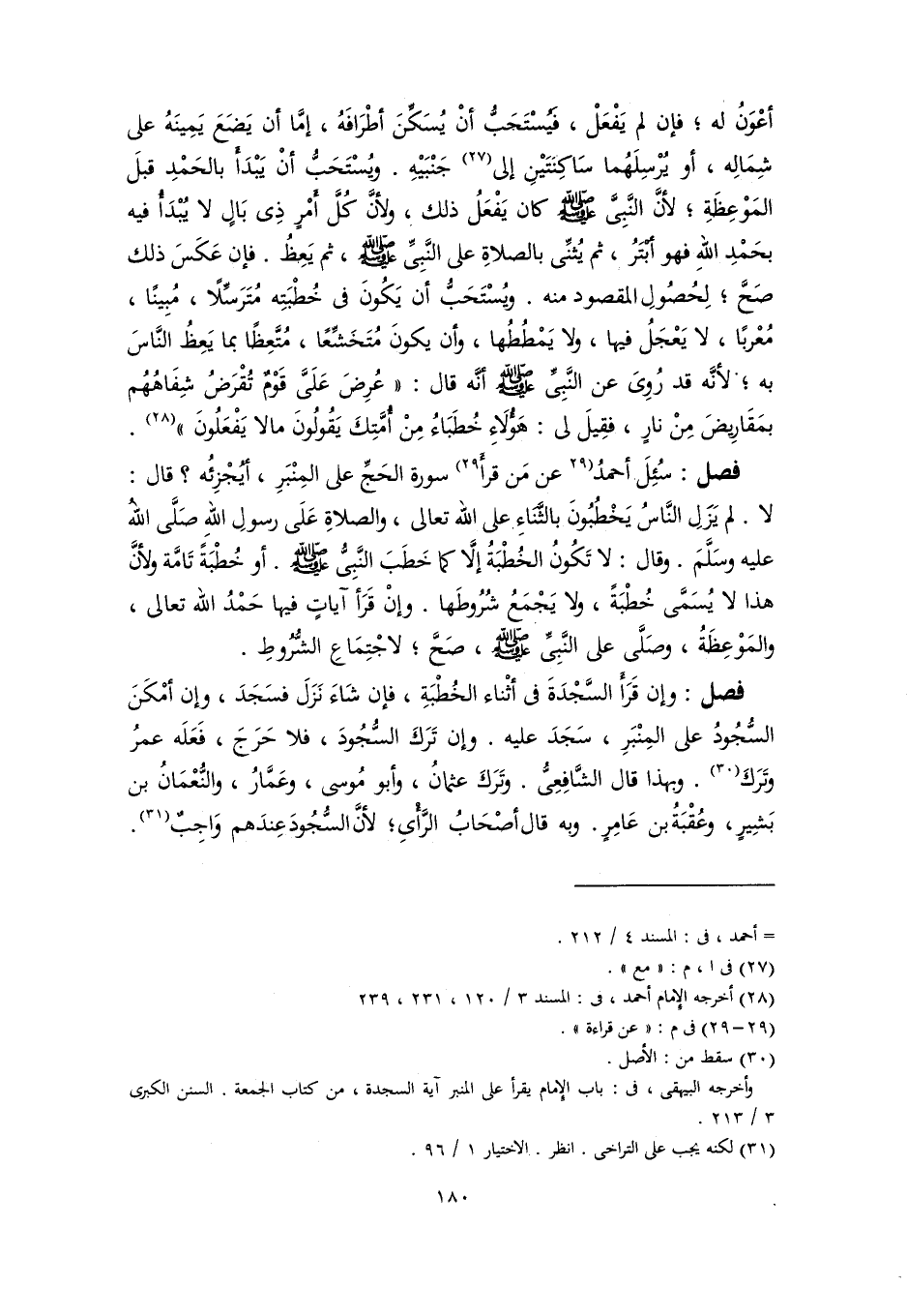 فصل: وإن قَرَأَ السَّجْدَةَ في أثْناء الخُطْبَةِ، فإن شَاءَ نَزَلَ فسَجَدَ، وإن أمْكَنَ السُّجُودُ على المِنْبَرِ، سَجَدَ عليه. وإن تَرَكَ السُّجُودَ، فلا حَرَجَ، فَعَلَه عمرُ وتَرَكَ (٣٠). وبهذا قال الشَّافِعِيُّ. وتَرَكَ عثمانُ، وأبو مُوسى، وعَمَّارُ، والنُّعْمَانُ بن بَشِيرٍ، وعُقْبَةُ بن عَامِرٍ. وبه قال أصْحَابُ الرَّأْىِ؛ لأنَّ السُّجُودَ عِندَهم وَاجِبٌ (٣١).
