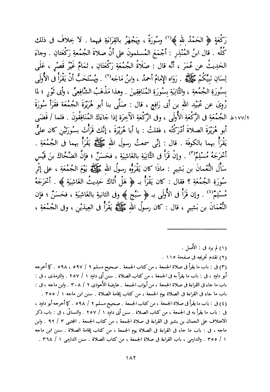 (٤) في: باب ما يقرأ في صلاة الجمعة، من كتاب الجمعة. صحيح مسلم ٢/ ٥٩٨. كما أخرجه أبو داود، في: باب ما يقرأ به في الجمعة، من كتاب الصلاة. سنن أبي داود ١/ ٢٥٧. والنسائي، في: باب ذكر الاختلاف على النعمان بن بشير في القراءة في صلاة الجمعة، من كتاب الجمعة. المجتبى ٣/ ٩٢. وابن ماجه، في: باب ما جاء في القراءة في الصلاة يوم الجمعة، من كتاب إقامة الصلاة. سنن ابن ماجه ١/ ٣٥٥. والدارمى، باب القراءة في صلاة الجمعة، من كتاب الصلاة. سنن الدارمي ١/ ٣٦٨.