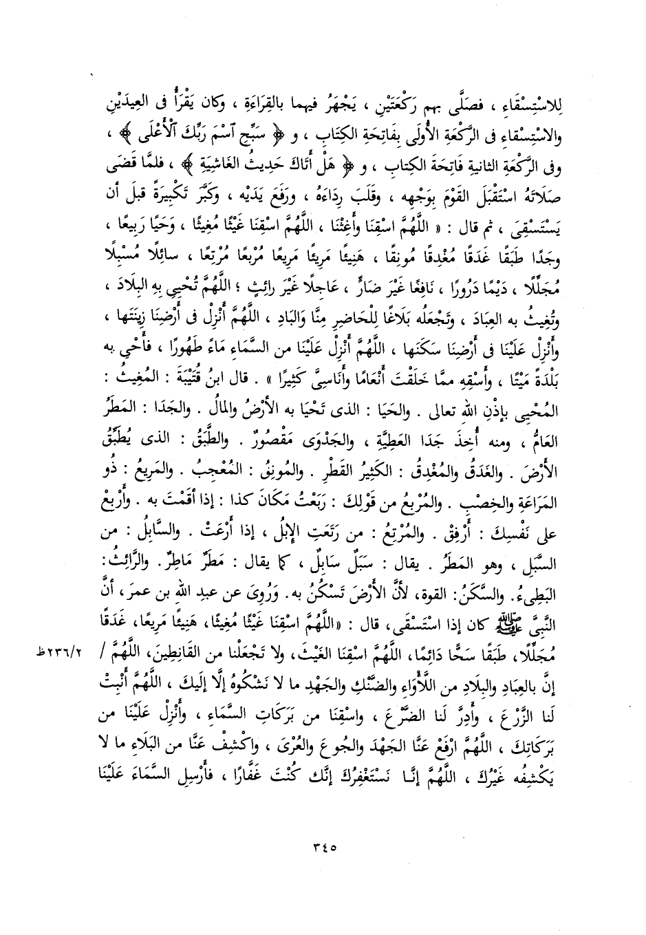 لِلاسْتِسْقَاءِ، فصَلَّى بهم رَكْعَتَيْنِ، يَجْهَرُ فيهما بالقِرَاءَةِ، وكان يَقْرأُ في العِيدَيْنِ والاسْتِسْقاءِ في الرَّكْعَةِ الأُولَى بِفَاتِحَةِ الكِتَابِ، و {سَبِّحِ اسْمَ رَبِّكَ الْأَعْلَى}، وفى الرَّكعَةِ الثانيةِ فَاتِحَةَ الكِتابِ، و {هَلْ أَتَاكَ حَدِيثُ الْغَاشِيَةِ} فلمَّا قَضَى صَلَاتَهُ اسْتَقْبَلَ القَوْمَ بِوَجْهِه، وقَلَبَ رِدَاءَهُ، ورَفَعَ يَدَيْه، وكَبَّرَ تَكْبِيرَةً قبلَ أن يَسْتَسْقِىَ، ثم قال: "اللَّهُمَّ اسْقِنَا وأَغِثْنَا، اللَّهُمَّ اسْقِنَا غَيْثًا مُغِيثًا، وَحَيًا رَبِيعًا، وجَدًا طَبَقًا غَدَقًا مُغْدِقًا مُونِقًا، هَنِيئًا مَرِيئًا مَرِيعًا مُرْبعًا مُرْتِعًا، سائِلًا مُسْبِلًا مُجَلِّلًا، دَيْمًا دَرُورًا، نَافِعًا غَيْرَ ضَارٍّ، عَاجِلًا غَيْرَ رائِثٍ؛ اللَّهُمَّ تُحْيىِ بِهِ البِلَادَ، وتُغِيثُ به العِبَادَ، وتَجْعَلُه بَلَاغًا لِلْحَاضِرِ مِنَّا وَالبَادِ، اللَّهُمَّ أَنْزِلْ في أَرْضِنَا زِينَتَها، وأَنْزِلْ عَلَيْنَا في أَرْضِنَا سَكَنَها، اللَّهُمَّ أَنْزِلْ عَلَيْنا من السَّمَاءِ مَاءً طَهُورًا، فأَحْىِ، به بَلْدَةً مَيْتًا، وأَسْقِهِ ممَّا خَلَقْتَ أَنْعَامًا وأَنَاسِىَّ كَثِيرًا". قال ابنُ قُتَيْبَةَ: المُغِيثُ: المُحْيِى بإذْنِ اللهِ تعالى. والحَيَا: الذي تَحْيَا به الأرْضُ والمالُ. والجَدَا: المَطَرُ العَامُّ، ومنه أُخِذَ جَدَا العَطِيَّةِ، والجَدْوَى مَقْصُورٌ. والطَّبَقُ: الذي يُطَبِّقُ الأَرْضَ. والغَدَقُ والمُغْدِقُ: الكَثِيرُ القَطْرِ. والمُونِقُ: المُعْجِبُ. والمَرِيعُ: ذُو المَرَاعَةِ والخِصْبِ. والمُرْبِعُ من قَوْلِكَ: رَبَعْتُ مَكَانَ كذا: إذا أقَمْتَ به. وأَرْبِعْ على نَفْسِكَ: أَرْفِقْ. والمُرْتِعُ: من رَتَعَتِ الإِبلُ، إذا أَرْعَتْ. والسَّابِلُ: من السَّبَلِ، وهو المَطَرُ. يقال: سَبَلٌ سَابِلٌ، كما يقال: مَطَرٌ مَاطِرٌ. والرَّائِثُ: البَطِىءُ. والسَّكَنُ: القوة، لأنَّ الأَرْضَ تَسْكُنُ به. وَرُوِىَ عن عبدِ اللهِ بن عمرَ، أنَّ النَّبِىَّ -صلى اللَّه عليه وسلم- كان إذا اسْتَسْقَى، قال: "اللَّهُمَّ اسْقِنَا غَيْثًا مُغِيثًا، هَنِيئًا مَرِيعًا، غَدَقًا مُجَلِّلًا، طَبَقًا سَحًّا دَائِمًا، اللَّهُمَّ اسْقِنَا الغَيْثَ، ولا تَجْعَلْنا من القَانِطِينَ، اللَّهُمَّ إنَّ بالعِبَادِ والبِلَادِ من اللَّأْوَاءِ والضَّنْكِ والجَهْدِ ما لا نَشْكُوهُ إلَّا إلَيكَ، اللَّهُمَّ أَنْبِتْ لَنا الزَّرْعَ، وأَدِرَّ لَنا الضَّرْعَ، واسْقِنَا من بَرَكَاتِ السَّمَاءِ، وأَنْزِلْ عَلَيْنَا من بَرَكَاتِكَ، اللَّهُمَّ ارْفَعْ عَنَّا الجَهْدَ والجُوعَ والعُرْىَ، واكْشِفْ عَنَّا من البَلَاءِ ما لا يَكْشِفُه غَيْرُكَ، اللَّهُمَّ إنَّا نَسْتَغْفِرُكَ إنَّك كُنْتَ غَفَّارًا، فأَرْسِلِ السَّمَاءَ عَلَيْنَا