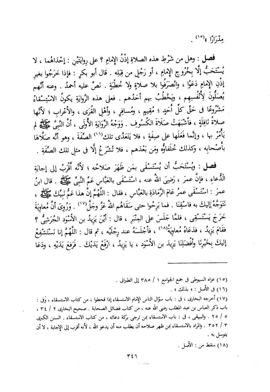 فصل: وهل من شَرْطِ هذه الصلاةِ إذْنُ الإِمامِ؟ على رِوايَتَيْنِ: إحْدَاهُما، لا يُسْتَحَبُّ إلَّا بِخُرُوجِ الإِمامِ، أو رَجُلٍ من قِبَلِه. قال أبو بكرٍ: فإذا خَرَجُوا بغيرِ إذْنِ الإِمامِ دَعَوْا، وانْصَرَفُوا بلا صلاةٍ ولا خُطْبَةٍ. نَصَّ عليه أحمدُ. وعنه أنَّهم يُصَلُّونَ لِأَنْفُسِهِم، ويَخْطُبُ بهم أحَدُهم. فعلى هذه الرِّوايَةِ يكونُ الاسْتِسْقاءُ مَشْرُوعًا في حَقِّ كلِّ أَحَدٍ؛ مُقِيمٍ، ومُسافِرٍ، وأهْلِ القُرَى، والأعْرابِ؛ لأنَّها صلاةُ نَافِلَةٍ، فأشْبَهَتْ صَلَاةَ الكُسُوفِ. وَوَجْهُ الرِّوَايَةِ الأُولَى، أنَّ النَّبِىَّ -صلى اللَّه عليه وسلم- لم يَأْمُرْ بها، وإنَّما فَعَلَها على صِفَةٍ، فلا يَتَعَدَّى تلك (١٦) الصِّفَةَ، وهو أنَّه صَلَّاهَا بأَصْحابِه، وكذلك خُلَفاؤُه ومَن بَعْدَهم، فلا تُشْرَعُ إلَّا في مثلِ تلك الصِّفَةِ.