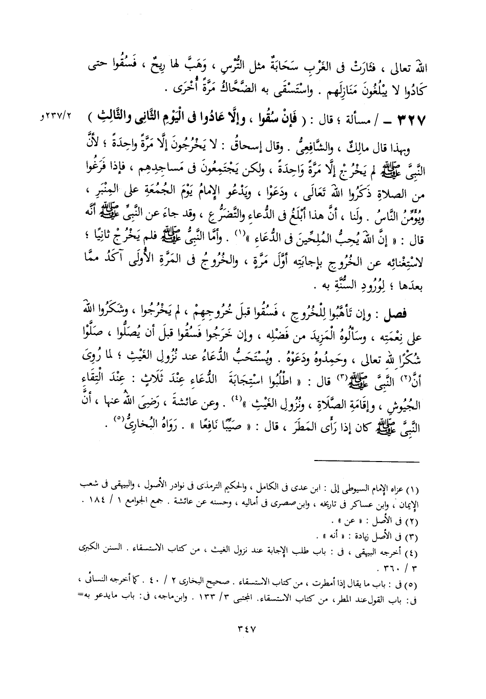 وبهذا قال مالِكٌ، والشَّافِعِىُّ. وقال إسحاقُ: لا يَخْرُجُونَ إلَّا مَرَّةً واحِدَةً؛ لأنَّ النَّبِىَّ -صلى اللَّه عليه وسلم- لم يَخْرُجْ إلَّا مَرَّةً وَاحِدَةً، ولكن يَجْتَمِعُونَ في مَساجِدِهِم، فإذا فَرَغُوا من الصلاةِ ذَكَرُوا اللهَ تَعَالَى، ودَعَوْا، ويَدْعُو الإِمامُ يَوْمَ الجُمُعَةِ على المِنْبَرِ، ويُؤَّمِّنُ النَّاسُ. ولَنا، أنَّ هذا أبْلَغُ في الدُّعاءِ والتَّضَرُّعِ، وقد جاءَ عن النَّبِيِّ -صلى اللَّه عليه وسلم- أنَّه قال: "إنَّ اللَّه يُحِبُّ المُلِحِّينَ في الدُّعَاءِ" (١). وأمَّا النَّبِىُّ -صلى اللَّه عليه وسلم- فلم يَخْرُجْ ثانِيًا؛ لاسْتِغْنائِه عن الخُرُوجِ بإجابَتِه أوَّلَ مَرَّةٍ، والخُرُوجُ في المَرَّةِ الأُولَى آكَدُ ممَّا بعدَها؛ لِوُرُودِ السُّنَّةِ به.