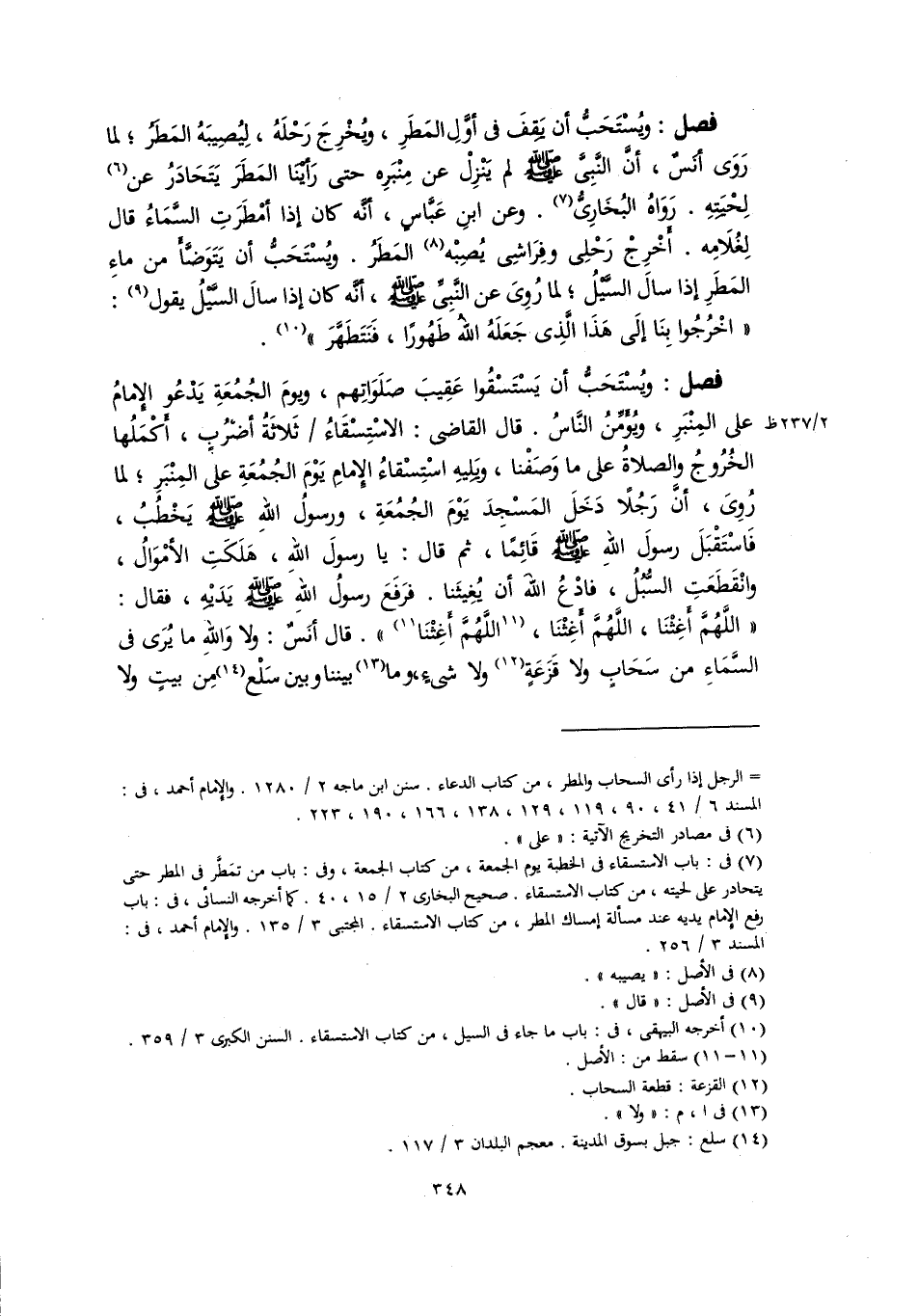 فصل: ويُسْتَحَبُّ أن يَقِفَ في أوَّلِ المَطَرِ، ويُخْرِجَ رَحْلَهُ، لِيُصِيبَهُ المَطَرُ؛ لما رَوَى أنَسٌ، أنَّ النَّبِىَّ -صلى اللَّه عليه وسلم- لم يَنْزِلْ عن مِنْبَرِه حتى رَأيْنَا المَطَرَ يَتَحَادَرُ عن (٦) لِحْيَتِهِ. رَوَاهُ البُخَارِيُّ (٧). وعن ابنِ عَبَّاسٍ، أنَّه كان إذا أمْطَرَتِ السَّمَاءُ قال لِغُلَامِه. أَخْرِجْ رَحْلِى وفِرَاشِى يُصِبْه (٨) المَطَرُ. ويُسْتَحَبُّ أن يَتَوَضَّأَ من ماءِ المَطَرِ إذا سالَ السَّيْلُ؛ لما رُوِىَ عن النَّبِيِّ -صلى اللَّه عليه وسلم-، أنَّه كان إذا سالَ السَّيْلُ يقول (٩): "اخْرُجُوا بِنَا إلَى هَذَا الَّذِى جَعَلَهُ اللهُ طَهُورًا، فَنَتَطَهَّرَ" (١٠).