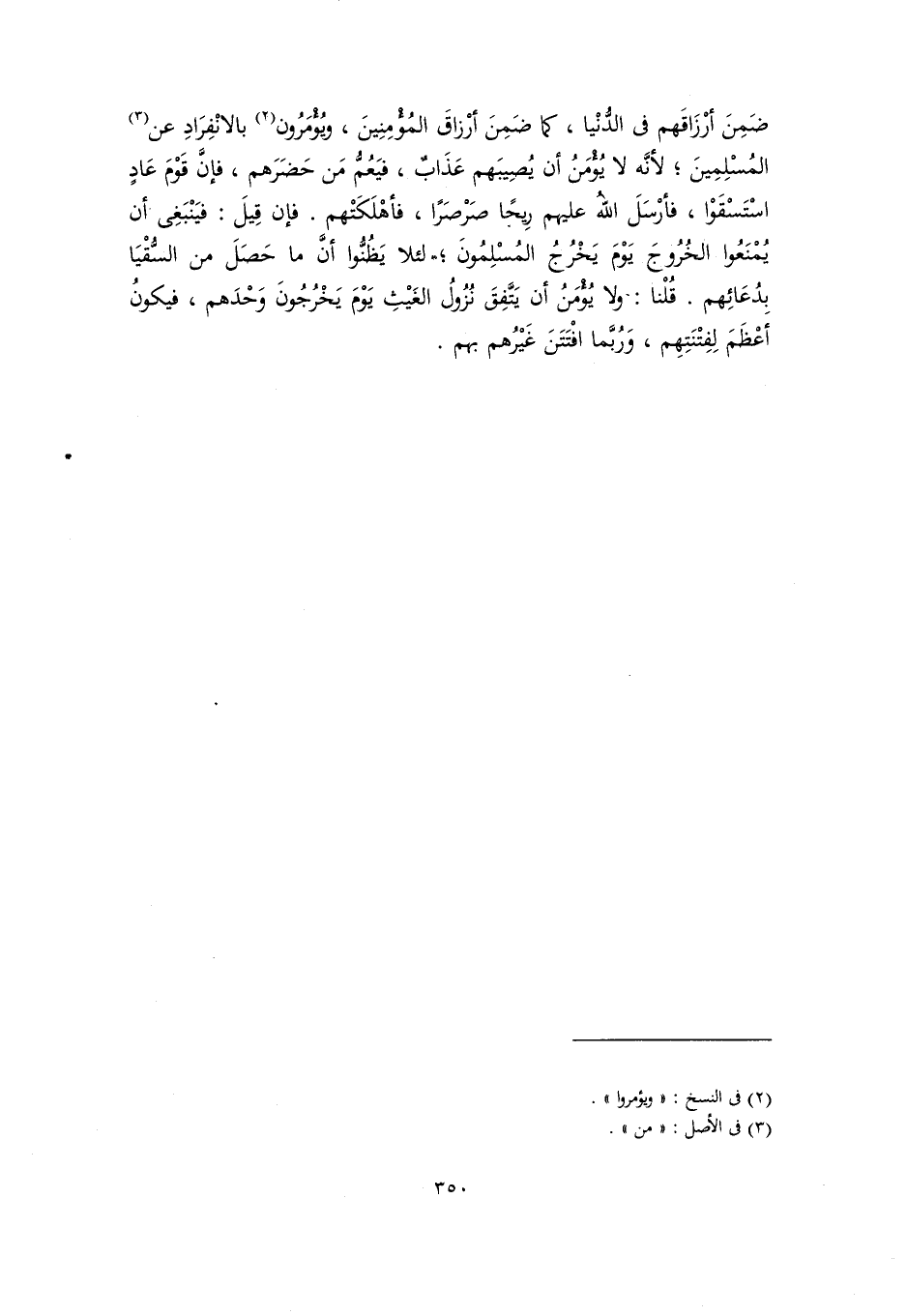 ضَمِنَ أرْزَاقَهم في الدُّنْيا، كما ضَمِنَ أرْزاقَ المُؤْمِنِينَ، ويُؤْمَرُون (٢) بالانْفِرَادِ عن (٣) المُسْلِمِينَ؛ لأنَّه لا يُؤْمَنُ أن يُصِيبَهم عَذَابٌ، فيَعُمُّ مَن حَضَرَهم، فإنَّ قَوْمَ عَادٍ اسْتَسْقَوْا، فأرْسَلَ اللهُ عليهم رِيحًا صَرْصَرًا، فأهْلَكَتْهم. فإن قِيلَ: فيَنْبَغِى أن يُمْنَعُوا الخُرُوجَ يَوْمَ يَخْرُجُ المُسْلِمُونَ؛ لئلا يَظُنُّوا أنَّ ما حَصَلَ من السُّقْيَا بِدُعَائِهم. قُلْنا: ولا يُؤْمَنُ أن يَتَّفِقَ نُزُولُ الغَيْثِ يَوْمَ يَخْرُجُونَ وَحْدَهم، فيكونُ أعْظَمَ لِفِتْنَتِهِم، وَرُبَّما افْتَتَنَ غَيْرُهم بهم.
