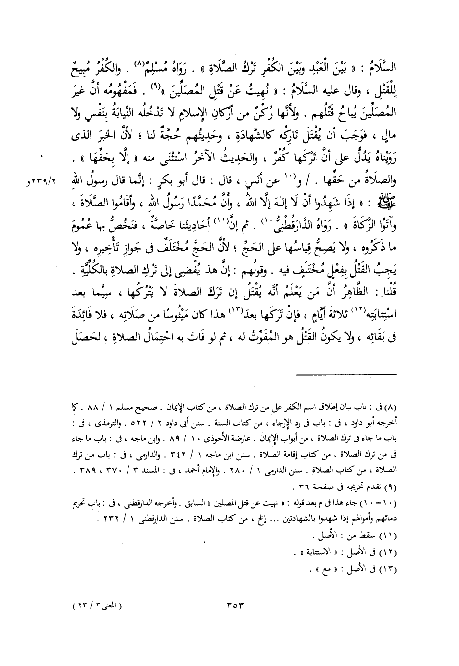 السَّلَامُ: "بَيْنَ الْعَبْدِ وَبيْنَ الكُفْرِ تَرْكُ الصَّلَاةِ". رَوَاهُ مُسْلِمٌ (٨). والكُفْرُ مُبِيحٌ لِلْقَتْلِ، وقال عليه السَّلَامُ: "نُهِيتُ عَنْ قَتْلِ المُصَلِّينَ" (٩). فَمَفْهُومُه أنَّ غيرَ المُصَلِّينَ يُباحُ قَتْلُهم. ولأنَّها رُكْنٌ من أرْكانِ الإِسلامِ لا تَدْخُلُه النِّيابَةُ بِنَفْسٍ ولا مالٍ، فوَجَبَ أن يُقْتَلَ تَاركُه كالشَّهادَةِ، وحَدِيثُهم حُجَّةٌ لنا؛ لأنَّ الخبرَ الذي رَوَيْناهُ يَدُلُّ على أنَّ تَرْكَها كُفْرٌ، والحَدِيثُ الآخَرُ اسْتثْنَى منه "إلَّا بِحَقِّهَا". والصلَاةُ من حَقِّها. و [عن أنَسٍ، قال: قال أبو بكرٍ: إنَّما قال رسولُ اللهِ -صلى اللَّه عليه وسلم-: "إذَا شَهِدُوا أنْ لَا إلهَ إلَّا اللهُ وأنَّ مُحَمَّدًا رَسُولُ اللهِ, وأقَامُوا الصَّلَاةَ، وآتَوُا الزَّكَاةَ". رَوَاهُ الدَّارَقُطْنِىُّ] (١٠). ثم إنَّ (١١) أحَادِيثَنا خَاصَّةٌ، فنَخُصُّ بها عُمُومَ ما ذَكَرُوه، ولا يَصِحُّ قِياسُها على الحَجِّ؛ لأنَّ الحَجَّ مُخْتَلَفٌ في جَوازِ تَأْخِيرِه، ولا يَجِبُ القَتْلُ بِفِعْلٍ مُخْتَلَفٍ فيه. وقولُهم: إنَّ هذا يُفْضِى إلى تَرْكِ الصلاةِ بالكُلِّيَّةِ. قُلْنا: الظَّاهِرُ أنَّ مَن يَعْلَمُ أنَّه يُقْتَلُ إن تَرَكَ الصلاةَ لا يَتْرُكُها، سِيَّما بعد اسْتِتابَتِه (١٢) ثلاثةَ ايَّامٍ، فإنْ تَرَكَها بعدَ (١٣) هذا كان مَيْئُوسًا من صَلَاتِه، فلا فَائِدَةَ في بَقَائِه، ولا يكونُ القَتْلُ هو المُفَوِّتُ له، ثم لو فَاتَ به احْتِمَالُ الصلاةِ، لحَصَلَ