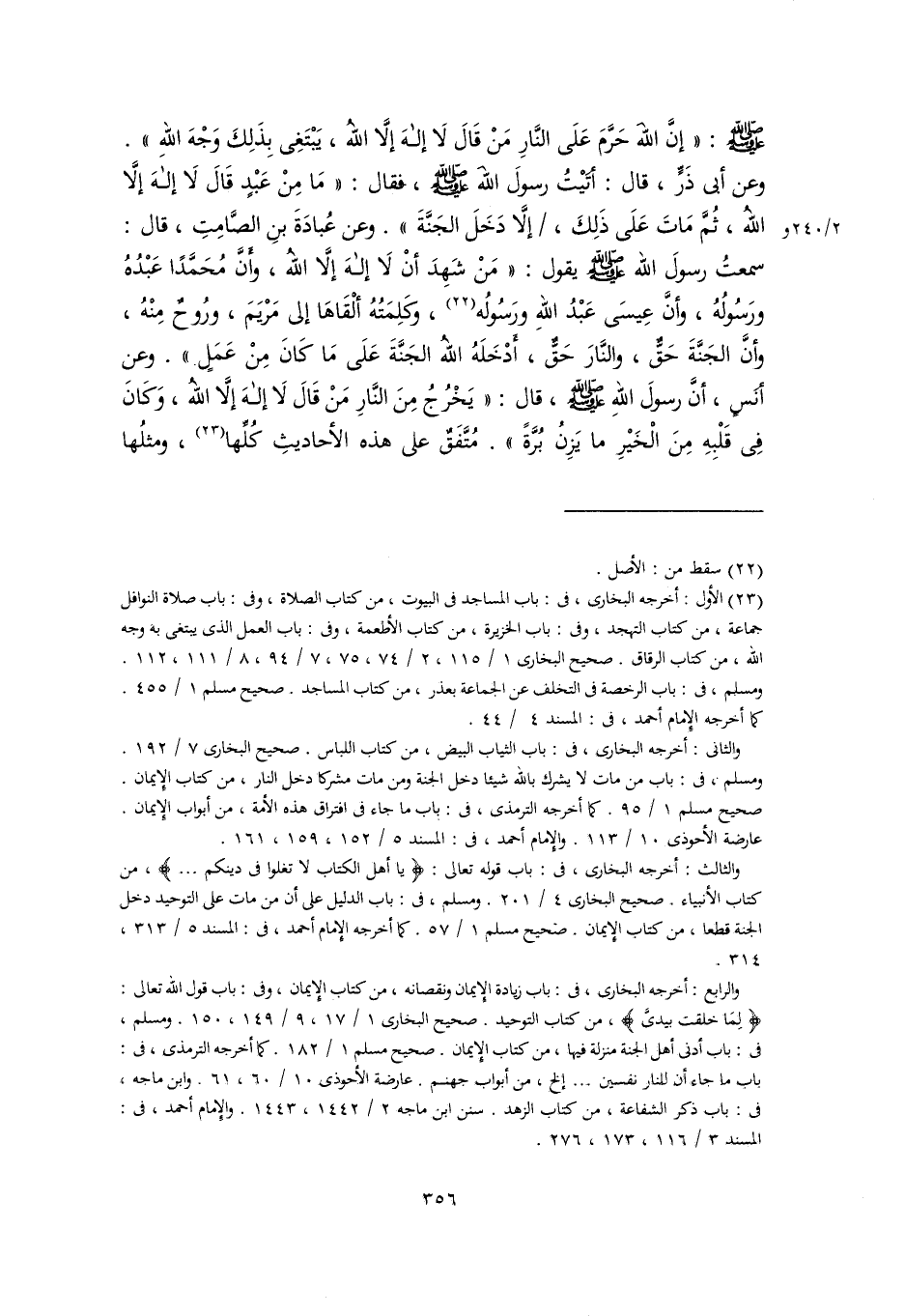 -صلى اللَّه عليه وسلم-: "إنَّ اللهَ حَرَّمَ عَلَى النَّارِ مَنْ قَالَ لَا إلهَ إلَّا اللهُ، يَبْتَغِى بِذَلِكَ وَجْهَ اللهِ". وعن أبي ذَرٍّ، قال: أتَيْتُ رسولَ اللَّه -صلى اللَّه عليه وسلم-، فقال: "مَا مِنْ عَبْدٍ قَالَ لَا إلَهَ إلَّا، اللهُ، ثُمَّ مَاتَ عَلَى ذَلِكَ، إلَّا دَخَلَ الجَنَةَ". وعن عُبادَةَ بنِ الصَّامِتِ، قال: سمعتُ رسولَ اللَّه -صلى اللَّه عليه وسلم- يقول: "مَنْ شَهِدَ أنْ لَا إلهَ إلَّا اللهُ، وأَنَّ مُحَمَّدًا عَبْدُهُ ورَسُولُهُ، وأنَّ عِيسَى عَبْدُ اللهِ ورَسُولُه (٢٢)، وكلِمَتُهُ ألْقَاهَا إلى مَرْيَمَ، ورُوحٌ مِنْهُ، وأنَّ الجَنَّةَ حَقٌّ، والنَّارَ حَقٌّ، أَدْخَلَهُ اللهُ الجَنَّةَ عَلَى مَا كَانَ مِنْ عَمَلٍ". وعن أنَسٍ، أنَّ رسولَ اللهِ -صلى اللَّه عليه وسلم-، قال: "يَخْرُجُ مِنَ النَّارِ مَنْ قَالَ لَا إلهَ إلَّا، اللهُ، وَكَانَ فِي قَلْبِهِ مِنَ الْخَيْرِ ما يَزِنُ بُرَّةً". مُتَّفَقٌ على هذه الأحاديثِ كُلِّها (٢٣)، ومثلُها