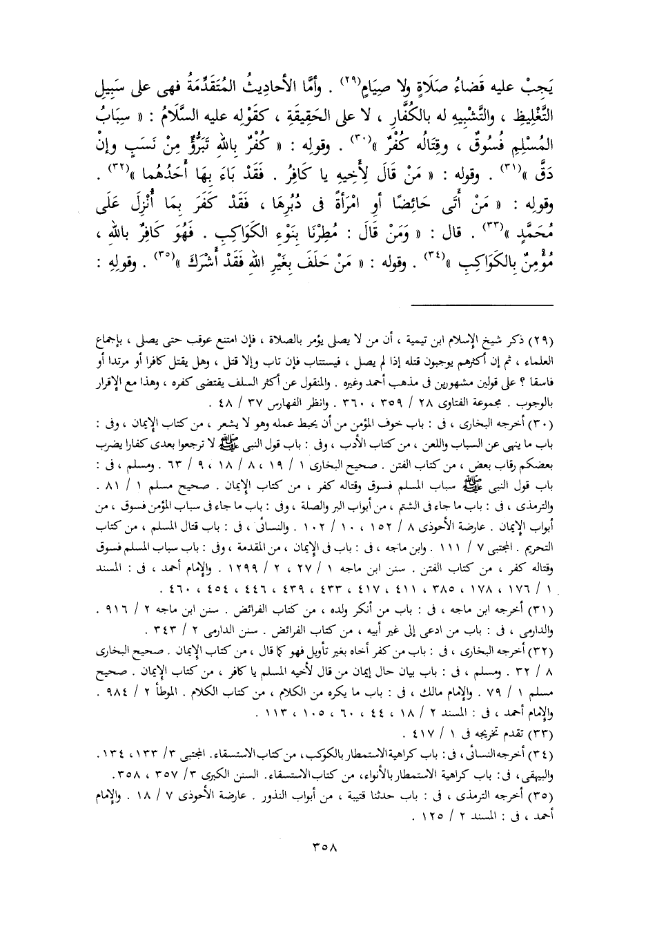 يَجِبْ عليه قَضاءُ صَلَاةٍ ولا صِيَامٍ (٢٩). وأمَّا الأحادِيثُ المُتَقَدِّمَةُ فهى على سَبِيلِ التَّغْلِيظِ، والتَّشْبِيهِ له بالكُفَّارِ، لا على الحَقِيقَةِ، كقَوْلِه عليه السَّلَامُ: "سِبَابُ المُسْلِمِ فُسُوقٌ، وقِتَالُه كُفْرٌ" (٣٠). وقولِه: "كُفْرٌ بِاللهِ تَبَرُّؤٌ مِنْ نَسَبٍ وإنْ دَقَّ" (٣١). وقوله: "مَنْ قَالَ لِأَخِيهِ يا كَافِرُ. فَقَدْ بَاءَ بِهَا أَحَدُهُما" (٣٢). وقولِه: "مَنْ أَتَى حَائِضًا أوِ امْرَأةً في دُبُرِهَا، فَقَدْ كَفَرَ بِمَا أُنْزِلَ عَلَى مُحَمَّدٍ" (٣٣). قال: "وَمَنْ قَالَ: مُطِرْنَا بِنَوْءِ الكَوَاكِبِ. فَهوَ كَافِرٌ باللهِ، مُؤْمِنٌ بِالكَوَاكِبِ" (٣٤). وقوله: "مَنْ حَلَفَ بِغَيْرِ اللهِ فَقَدْ أَشْرَكَ" (٣٥). وقولِهِ: