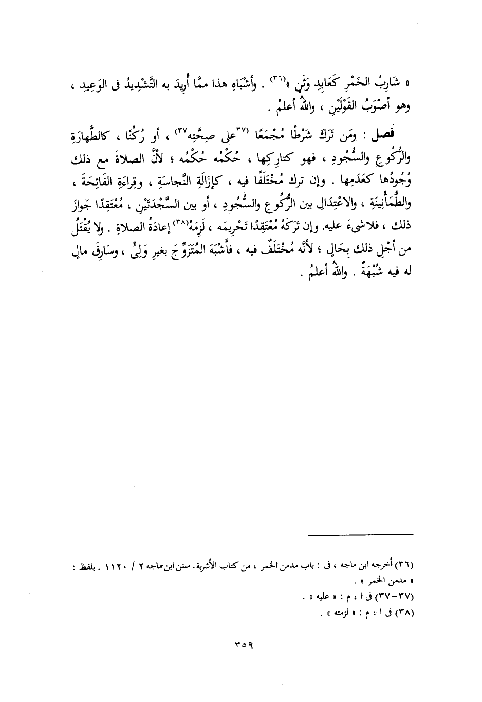 "شَارِبُ الخَمْرِ كَعَابِدِ وَثَنٍ" (٣٦). وأشْبَاهِ هذا ممَّا أُرِيدَ به التَّشْدِيدُ في الوَعِيدِ، وهو أصْوَبُ القَوْلَيْنِ، واللهُ أعلمُ.