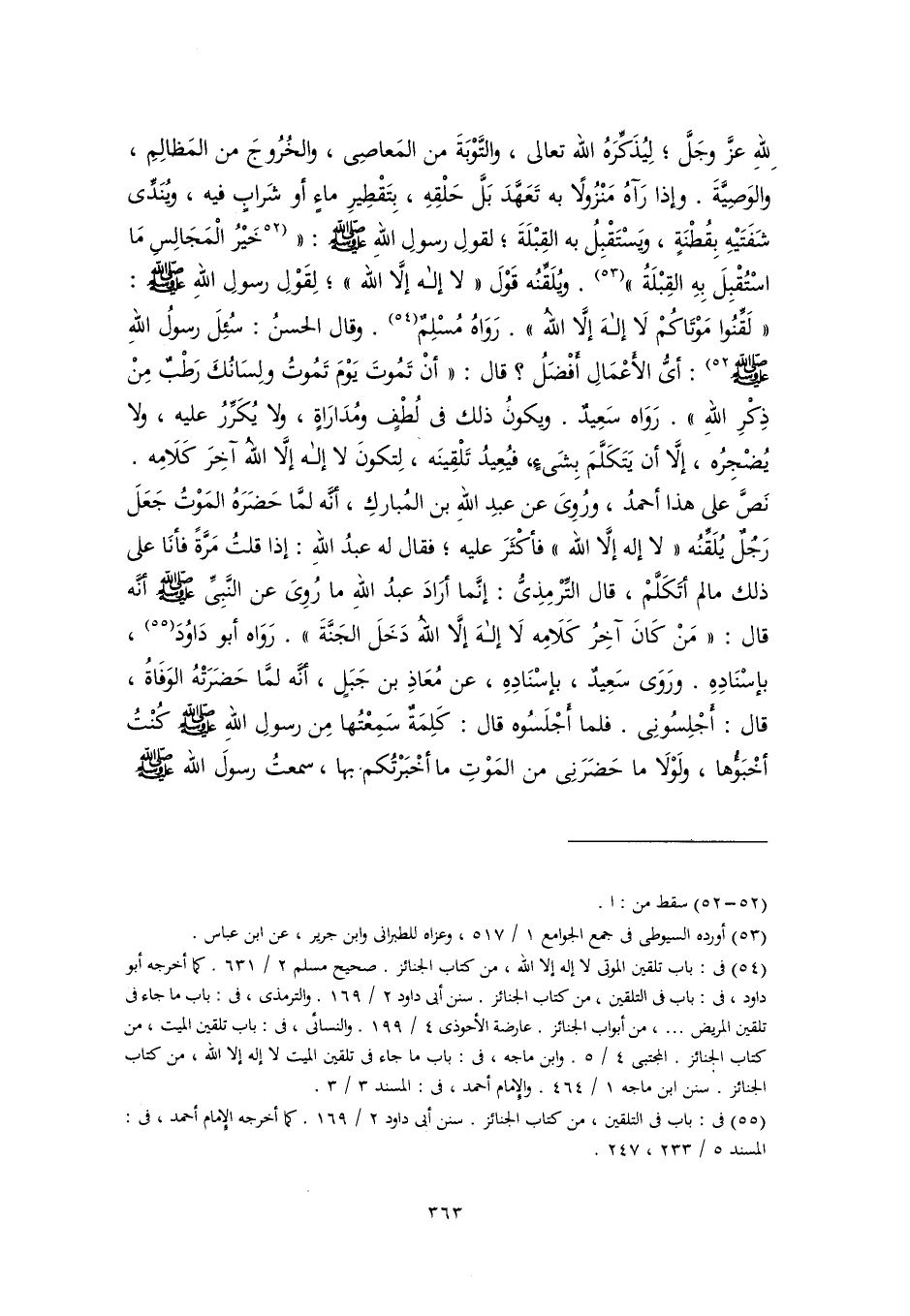 (٥٥) في: باب في التلقين، من كتاب الجنائز. سنن أبي داود ٢/ ١٦٩. كما أخرجه الإِمام أحمد، في: المسند ٥/ ٢٣٣، ٢٤٧.