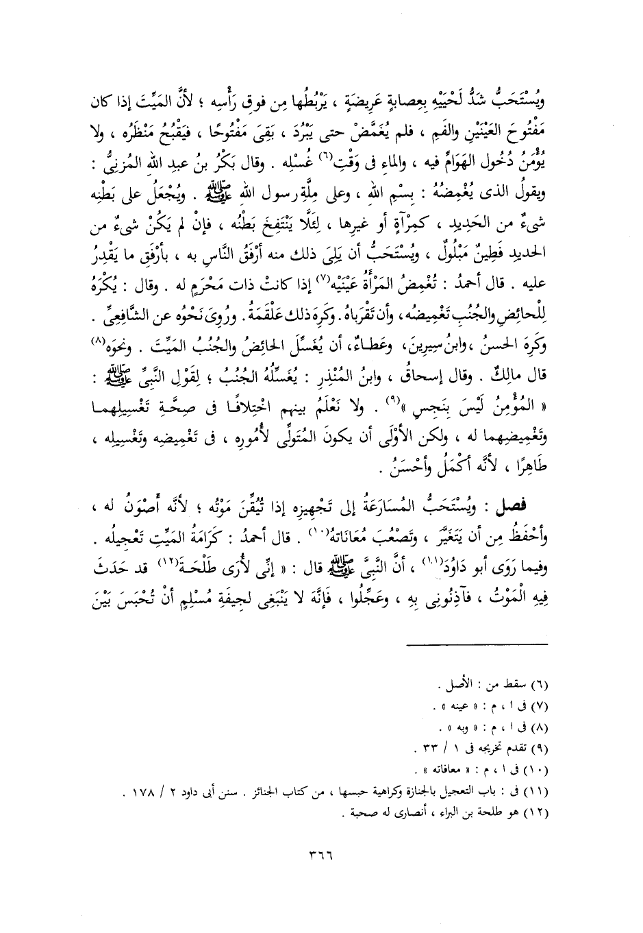 فصل: ويُسْتَحَبُّ المُسَارَعَةُ إلى تَجْهِيزِه إذا تُيُقِّنَ مَوْتُه؛ لأنَّه أَصْوَنُ له، وأحْفَظُ مِن أن يَتَغَيَّرَ، وتَصْعُبَ مُعَانَاتهُ (١٠). قال أحمدُ: كَرَامَةُ المَيِّتِ تَعْجِيلُه. وفيما رَوَى أبو دَاوُدَ (١١)، أنَّ النَّبِيَّ -صلى اللَّه عليه وسلم- قال: "إنِّي لأُرَى طَلْحَةَ (١٢) قد حَدَثَ فِيهِ الْمَوْتُ، فآذِنُونِى بِهِ، وعَجِّلُوا، فَإنَّه لا يَنْبَغِى لجِيفَةِ مُسْلِمٍ أنْ تُحْبَسَ بَيْنَ