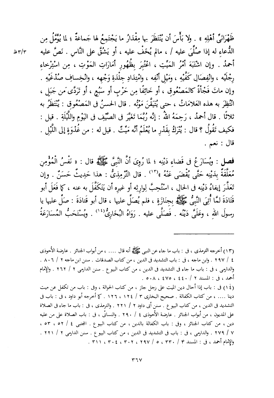 فصل: ويُسَارَعُ في قَضاءِ دَيْنِه؛ لما رُوِىَ أنَّ النَّبِىَّ -صلى اللَّه عليه وسلم- قال: "نَفْسُ الْمُؤْمِنِ مُعَلَّقَةٌ بِدَيْنِه حَتَّى يُقْضَى عَنْهُ" (١٣). قال التِّرْمِذِىُّ: هذا حَدِيثٌ حَسَنٌ. وإن تَعَذَّرَ إيفاءُ دَيْنِه في الحالِ، اسْتُحِبَّ لِوارِثِه أو غيرِه أن يَتَكَفَّلَ به عنه، كما فَعَلَ أبو قَتَادَةَ لمَّا أُتِىَ النَّبِىُّ -صلى اللَّه عليه وسلم- بِجِنَازَةٍ، فلم يُصَلِّ عليها، قال أبو قَتادَةَ: صَلِّ عليها يا رسولَ اللهِ، وعَلَىَّ دَيْنُه. فَصَلَّى عليه. رَوَاهُ البُخَارِىُّ (١٤). ويُسْتَحَبُّ المُسَارَعَةُ