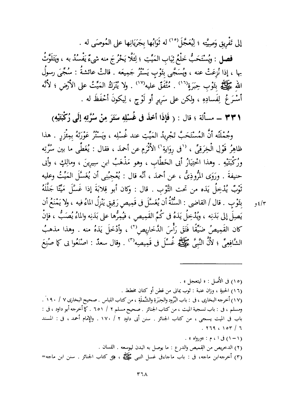 فصل: ويُسْتَحَبُّ خَلْعُ ثِيَابِ المَيِّتِ؛ لِئَلَّا يَخْرُجَ منه شيءٌ يَفْسُدُ به، ويَتَلَوَّثُ بها، إذا نُزِعَتْ عنه، ويُسَجَّى بِثَوْبٍ يَسْتُرُ جَمِيعَه. قالتْ عائشةُ: سُجِّىَ رسولُ اللهِ -صلى اللَّه عليه وسلم- بِثَوْبِ حِبَرَةٍ (١٦). مُتَّفَقٌ عليه (١٧). ولا يُتْرَكُ المَيِّتُ على الأرْضِ؛ لأنَّه أسْرَعُ لِفَسادِهِ، ولكن على سَرِيرٍ أو لَوْحٍ، لِيكونَ أحْفَظَ له.