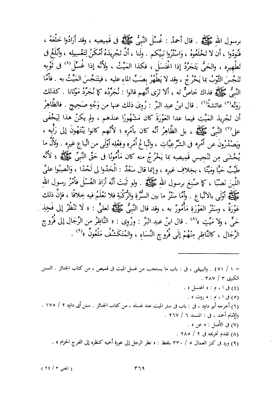 برسولِ اللهِ -صلى اللَّه عليه وسلم-. قال أحمدُ: غُسِّلَ النَّبِىُّ -صلى اللَّه عليه وسلم- في قَمِيصِه، وقد أرَادُوا خَلْعَهُ، فَنُودُوا، أن لا تَخْلَعُوهُ، وَاسْتُرُوا نَبِيَّكم. ولَنا، أنَّ تَجْرِيدَهُ أمْكَنُ لِتَغْسِيلِه، وأبْلَغُ في تَطْهِيرِه، والحَىُّ يَتَجَرَّدُ إذا اغْتَسَلَ، فكذا المَيِّتُ، ولأنَّه إذا غُسِّلَ (٤) في ثوْبِه تَنَجَّسَ الثَّوْبُ بما يَخْرُجُ، وقد لا يَطْهُرُ بِصَبِّ الماءِ عليه، فيتَنَجَّسَ المَيِّتُ به. فأمَّا النَّبِىُّ -صلى اللَّه عليه وسلم- فذاك خَاصٌّ له، ألا تَرَى أنَّهم قالوا: نُجَرِّدُه كما نُجَرِّدُ مَوْتَانا. كذلك رَوَتْه (٥) عائشةُ (٦). قال ابنُ عبدِ البَرِّ: رُوِىَ ذلك عنها من وَجْهٍ صَحِيحٍ. فالظَّاهِرُ أن تَجْرِيدَ المَيِّتِ فيما عدا العَوْرَةَ كان مَشْهُورًا عندَهم، ولم يكنْ هذا لِيَخْفَى على (٧) النَّبِيِّ -صلى اللَّه عليه وسلم-، بل الظَّاهِرُ أنَّه كان بأمْرِه؛ لأنَّهم كانوا يَنْتَهُونَ إلى رَأْيِه، ويَصْدُرُونَ عن أمْرِه في الشَّرْعِيَّاتِ، واتِّبِاعُ أَمْرِهِ وفِعْلِه أوْلَى من اتِّباعِ غيرِه. ولأنَّ ما يُخْشَى مِن تَنْجِيسِ قَمِيصِه بما يَخْرُجُ منه كان مَأْمُونًا في حَقِّ النَّبِيِّ -صلى اللَّه عليه وسلم-؛ لأنَّه طَيِّبٌ حَيًّا ومَيِّتًا، بخِلافِ غيرِه، وإنما قال سَعْدٌ: الْحَدُوا لي لَحْدًا، وَانْصِبُوا علىَّ اللَّبِنَ نَصْبًا، كما صُنِعَ برسولِ اللهِ -صلى اللَّه عليه وسلم-. ولو ثَبَتَ أنَّه أرَادَ الغُسْلَ فأمْرُ رسولِ اللهِ -صلى اللَّه عليه وسلم- أوْلَى بالاتِّباعِ. وأمَّا سَتْرُ ما بين السُّرَّةِ والرُّكْبَةِ فلا نَعْلَمُ فيه خِلافًا، فإنَّ ذلك عَوْرَةٌ، وسَتْرُ العَوْرَةِ مَأْمُورٌ به، وقد قال النَّبِىُّ -صلى اللَّه عليه وسلم- لعلىٍّ: "لَا تَنْظُرْ إلى فَخِذِ حَىٍّ، ولا مَيِّتٍ" (٨). قال ابنُ عبدِ البَرِّ: ورُوِى: "النَّاظِرُ من الرِّجَالِ إلى فُرُوجِ الرِّجَالِ، كالنَّاظِرِ مِنْهُمْ إلَى فُرُوجِ النِّسَاءِ، والمُتَكَشِّفُ مَلْعُونٌ" (٩).