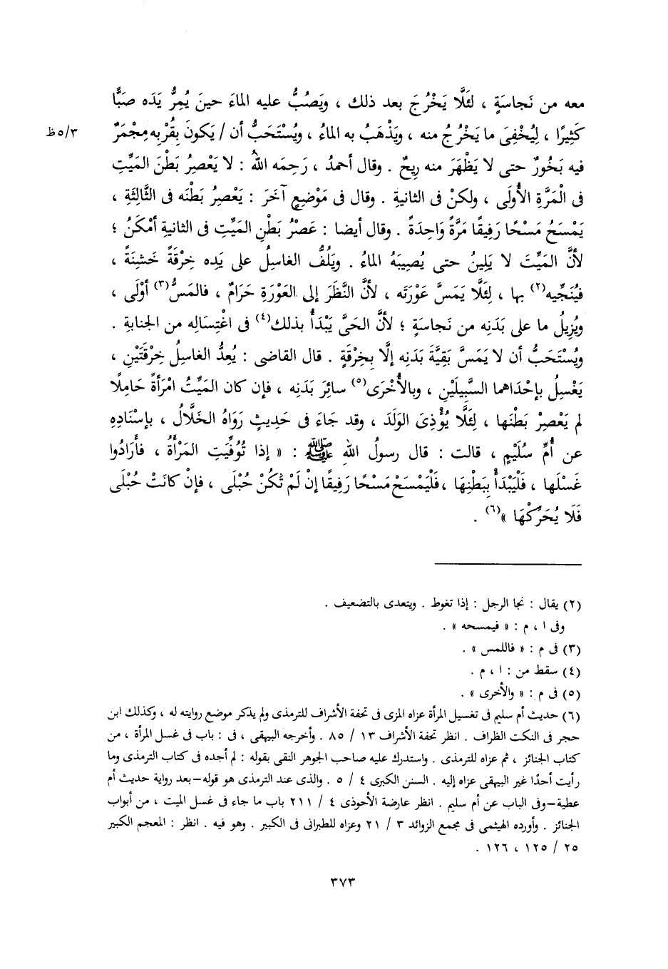 معه من نَجاسَةٍ، لئَلَّا يَخْرُجَ بعد ذلك، ويَصُبُّ عليه الماءَ حينَ يُمِرُّ يَدَه صَبًّا كَثِيرًا، لِيُخْفِىَ ما يَخْرُجُ منه، ويَذْهَبُ به الماءُ، ويُسْتَحَبُّ أن يَكونَ بِقرْبِه مِجْمَرٌ فيه بَخُورٌ حتى لا يَظْهَرَ منه ريِحٌ. وقال أحمدُ، رَحِمَه اللهُ: لا يَعْصِرُ بَطْنَ المَيِّتِ في الْمَرَّةِ الأُولَى، ولكن في الثانيةِ. وقال في مَوْضِعٍ آخَرَ: يَعْصِرُ بَطْنَه في الثَّالِثَةِ، يَمْسَحُ مَسْحًا رَفِيقًا مَرَّةً وَاحِدَةً. وقال أيضًا: عَصْرُ بَطْنِ المَيِّتِ في الثانيةِ أمْكَنُ؛ لأنَّ المَيِّتَ لا يَلِينُ حتى يُصِيبَهُ الماءُ. ويَلُفُّ الغاسِلُ على يَدِه خِرْقَةً خَشِنَةً، فيُنَجِّيه (٢) بها، لِئَلَّا يَمَسَّ عَوْرَتَه، لأنَّ النَّظَرَ إلى العَوْرَةِ حَرَامٌ، فالمَسُّ (٣) أوْلَى، ويُزِيلُ ما على بَدَنِه من نَجاسَةٍ؛ لأنَّ الحَىَّ يَبْدَأُ بذلك (٤) في اغْتِسَالِه من الجنابةِ. ويُسْتَحَبُّ أن لا يَمَسَّ بَقِيَّةَ بَدَنِه إلَّا بِخِرْقَةٍ. قال القاضي: يُعِدُّ الغاسِلُ خِرْقَتَيْنِ، يَغْسِلُ بإحْدَاهما السَّبِيلَيْنِ، وبالأُخْرَى (٥) سائِرَ بَدَنِه، فإن كان المَيِّتُ امْرَأةً حَامِلًا لم يَعْصِرْ بَطْنَها، لِئَلَّا يُؤْذِىَ الوَلَدَ، وقد جَاءَ في حَدِيثٍ رَوَاهُ الخَلَّالُ، بإسْنَادِهِ عن أُمِّ سُلَيْمٍ، قالت: قال رسولُ اللهِ -صلى اللَّه عليه وسلم-: "إذا تُوُفِّيَتِ المَرْأَةُ، فأَرَادُوا غَسْلَها، فَلْيَبْدَأْ بِبَطْنِهَا، فَلْيَمْسَحْ مَسْحًا رَفِيقًا إنْ لَمْ تَكُنْ حُبْلَى، فإنْ كانَتْ حُبْلَى فَلَا يُحَرِّكْهَا" (٦).