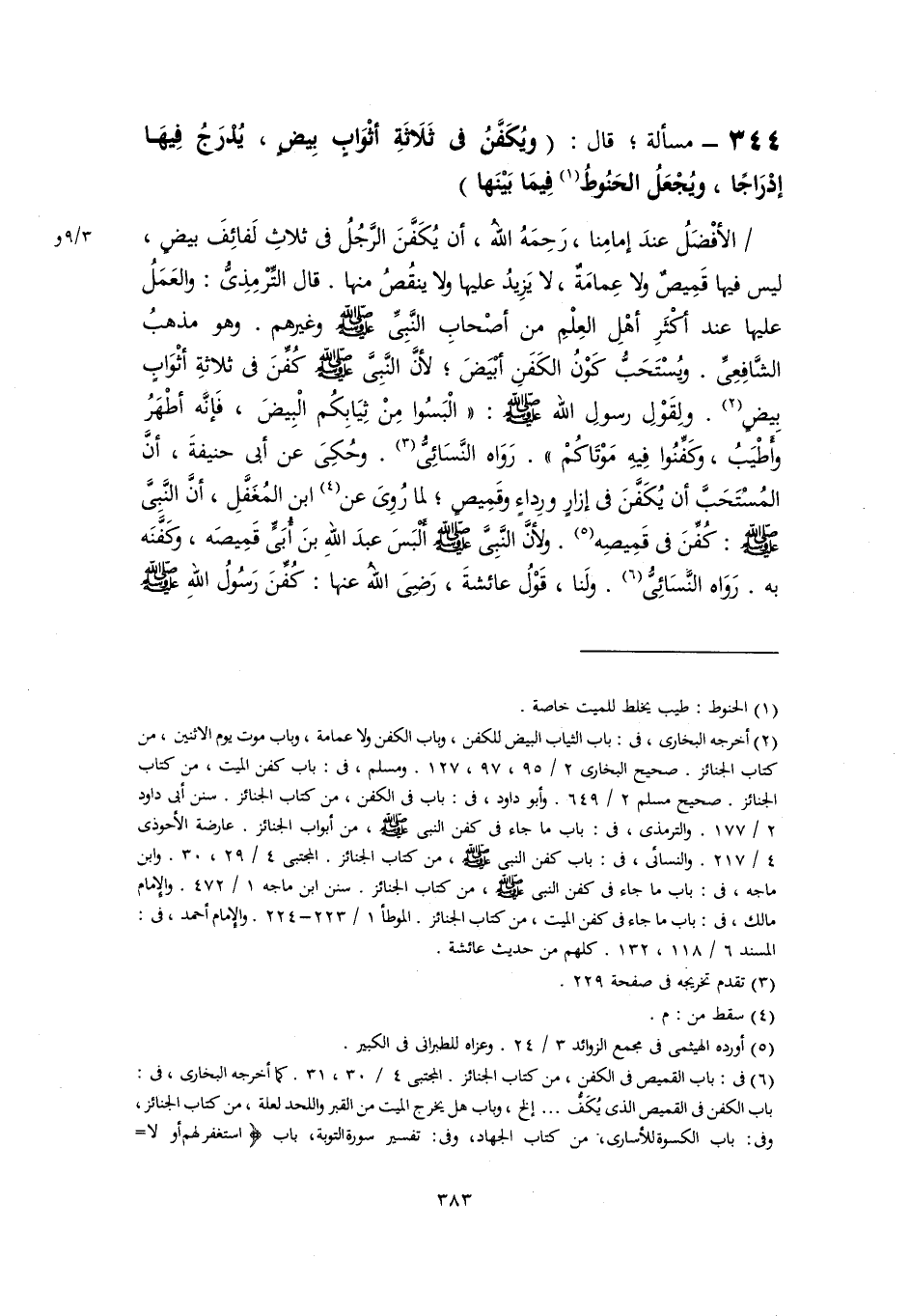 ٣٤٤ - مسألة؛ قال: (ويُكَفَّنُ في ثَلَاثَةِ أثْوَابٍ بِيضٍ، يُدْرَجُ فِيهَا إدْرَاجًا، ويُجْعَلُ الحَنُوطُ (١) فِيمَا بَيْنَها)