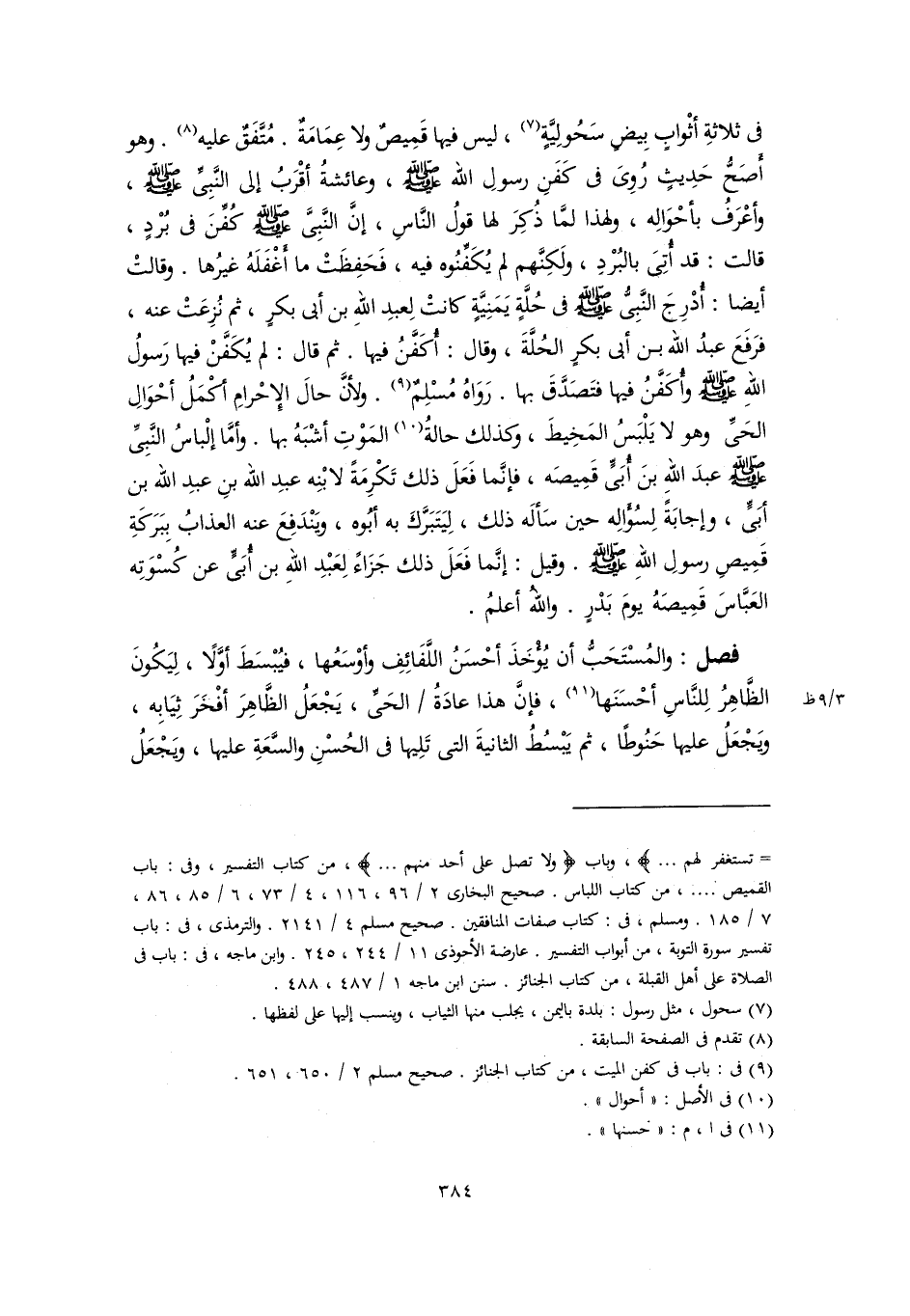 في ثلاثةِ أثْوابٍ بِيضٍ سَحُولِيَّةٍ (٧)، ليس فيها قَمِيصٌ ولا عِمَامَةٌ. مُتَّفَقٌ عليه (٨). وهو أَصَحُّ حَدِيثٍ رُوِىَ في كَفَنِ رسولِ اللَّه -صلى اللَّه عليه وسلم-، وعائشةُ أقْرَبُ إلى النَّبِيِّ -صلى اللَّه عليه وسلم-، وأعْرَفُ بأحْوَالِه، ولهذا لمَّا ذُكِرَ لها قولُ النَّاسِ، إنَّ النَّبِىَّ -صلى اللَّه عليه وسلم- كُفِّنَ في بُرْدٍ، قالت: قد أُتِىَ بالبُرْدِ، ولَكِنَّهم لم يُكَفِّنُوه فيه، فَحَفِظَتْ ما أَغفَلَهُ غيرُها. وقالتْ أيضًا: أُدْرِجَ النَّبِىُّ -صلى اللَّه عليه وسلم- في حُلَّةٍ يَمَنِيَّةٍ كانتْ لِعبدِ اللهِ بن أبي بكرٍ، ثم نُزِعَتْ عنه، فرَفَعَ عبدُ اللَّه بن أبي بكرٍ الحُلَّةَ، وقال: أُكَفَّنُ فيها. ثم قال: لم يُكَفَّنْ فيها رَسولُ اللهِ -صلى اللَّه عليه وسلم- وأُكَفَّنُ فيها فتَصَدَّقَ بها. رَوَاهُ مُسْلِمٌ (٩). ولأنَّ حالَ الإِحْرامِ أكْمَلُ أحْوَالِ الحَىِّ وهو لا يَلْبَسُ المَخِيطَ، وكذلك حالةُ (١٠) المَوْتِ أشْبَهُ بها. وأمَّا إلْباسُ النَّبِيِّ -صلى اللَّه عليه وسلم- عبدَ اللهِ بنَ أُبَىٍّ قَمِيصَه، فإنَّما فَعَلَ ذلك تَكْرِمَةً لابْنِه عبدِ اللَّه بنِ عبدِ اللَّه بن أبَيٍّ، وإجابَةً لِسُؤَالِه حين سَألَه ذلك، لِيَتَبَرَّكَ به أبُوه، ويَنْدَفِعَ عنه العذابُ بِبَرَكَةِ قَمِيصِ رسولِ اللهِ -صلى اللَّه عليه وسلم-. وقيل: إنَّما فَعَلَ ذلك جَزَاءً لِعَبْدِ اللهِ بن أُبَىٍّ عن كُسْوَتِه العَبَّاسَ قَمِيصَهُ يومَ بَدْرٍ. واللهُ أعلمُ.
