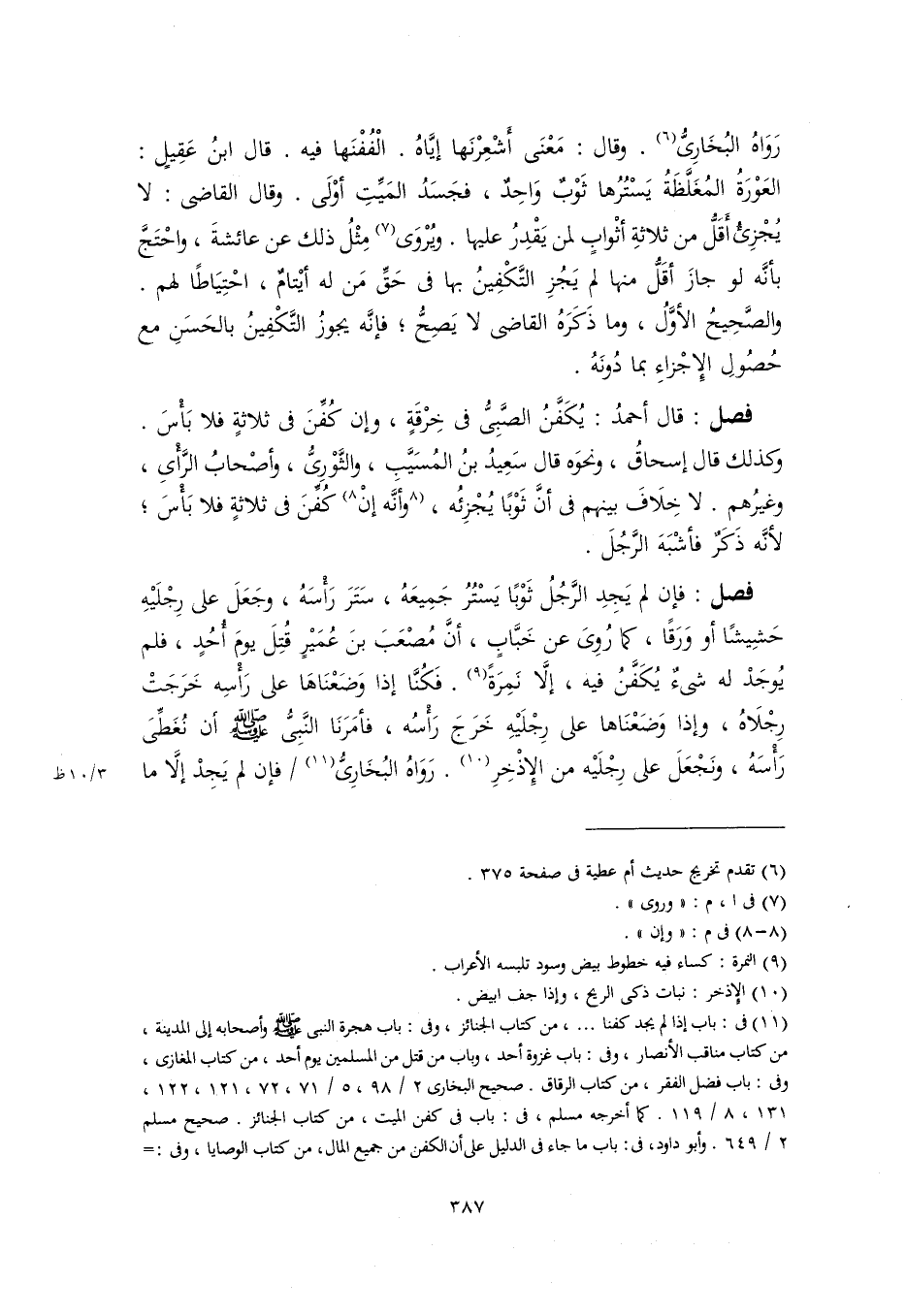 رَوَاهُ البُخَارِيُّ (٦). وقال: مَعْنَى أَشْعِرْنَها إيَّاهُ. الْفُفْنَها فيه. قال ابنُ عَقِيلٍ: العَوْرَةُ المُغَلَّظَةُ يَسْتُرُها ثَوْبٌ وَاحِدٌ، فجَسَدُ المَيِّتِ أوْلَى. وقال القاضي: لا يُجْزِئُ أَقَلُّ من ثلاثةِ أثْوابٍ لمن يَقْدِرُ عليها. ويُرْوَى (٧) مِثْلُ ذلك عن عائشةَ، واحْتَجَّ بأنَّه لو جازَ أقَلُّ منها لم يَجُزِ التَّكْفِينُ بها في حَقِّ مَن له أيْتامٌ، احْتِيَاطًا لهم. والصَّحِيحُ الأوَّلُ، وما ذَكَرَهُ القاضي لا يَصِحُّ؛ فإنَّه يجوزُ التَّكْفِينُ بالحَسَنِ مع حُصُولِ الإِجْزاءِ بما دُونَهُ.