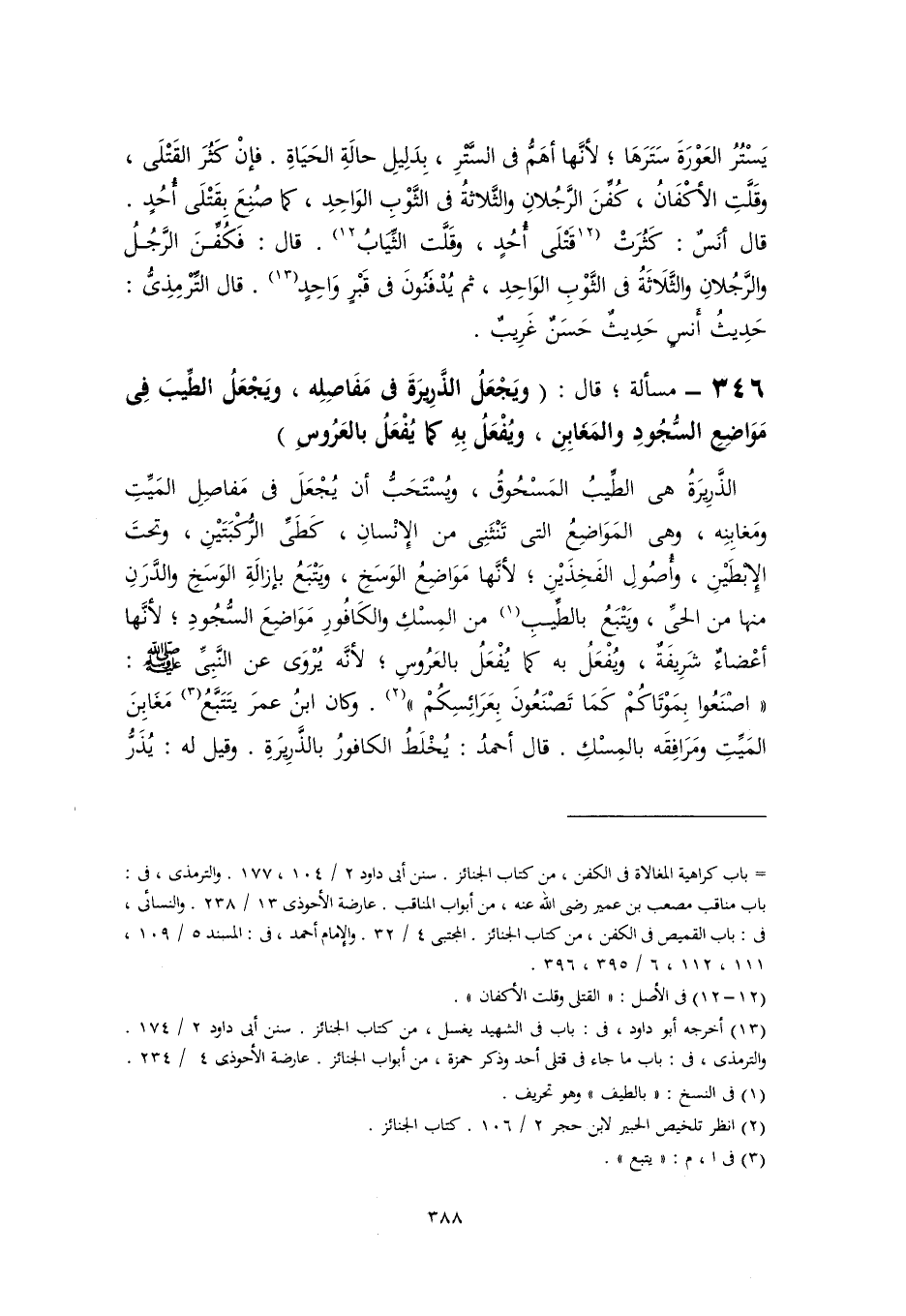 (١٣) أخرجه أبو داود، في: باب في الشهيد يغسل، من كتاب الجنائز. سنن أبي داود ٢/ ١٧٤. والترمذي، في: باب ما جاء في قتلى أحد وذكر حمزة، من أبواب الجنائز. عارضة الأحوذى ٤/ ٢٣٤.