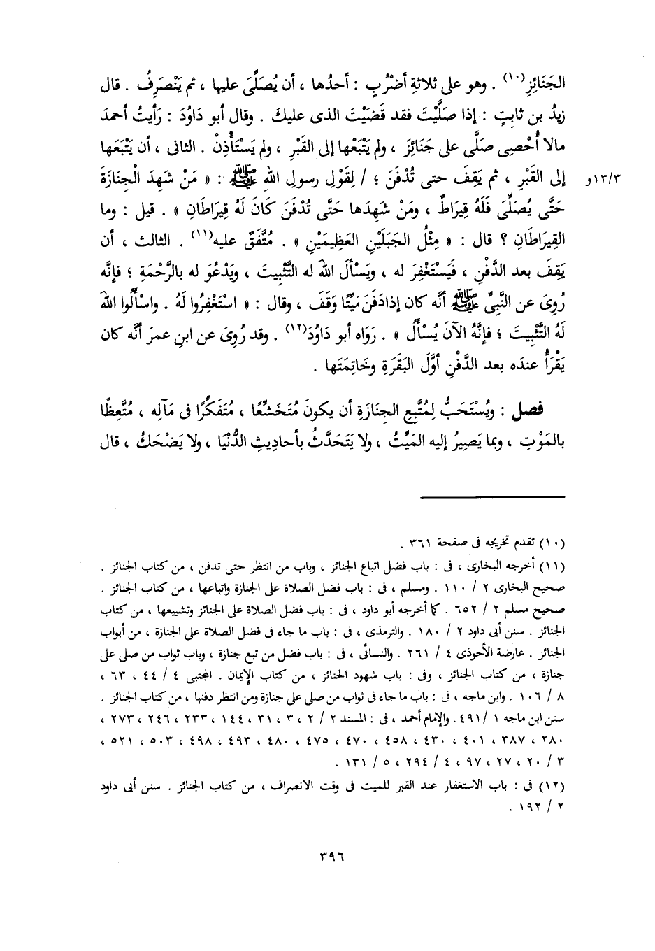 الجَنَائِزِ (١٠). وهو على ثلاثةِ أضْرُبٍ: أحدُها، أن يُصَلِّىَ عليها، ثم يَنْصَرِفُ. قال زيدُ بن ثابِتٍ: إذا صَلَّيْتَ فقد قَضَيْتَ الذي عليكَ. وقال أبو دَاوُدَ: رَأيتُ أحمدَ مالا أُحْصِى صَلَّى على جَنَائِزَ، ولم يَتْبَعْها إلى القَبْرِ، ولم يَسْتَأْذِنْ. الثاني، أن يَتْبَعَها إلى القَبْرِ، ثم يَقِفَ حتى تُدْفَنَ؛ لِقَوْلِ رسولِ اللهِ -صلى اللَّه عليه وسلم-: "مَنْ شَهِدَ الْجِنَازَةَ حَتَّى يُصَلِّىَ فَلَهُ قِيرَاطٌ، ومَنْ شَهِدَها حَتَّى تُدْفَنَ كَانَ لَهُ قِيرَاطَانِ". قيل: وما القِيرَاطَانِ؟ قال: "مِثْلُ الجَبَلَيْنِ العَظِيمَيْنِ". مُتَّفَقٌ عليه (١١). الثالث، أن يَقِفَ بعد الدَّفْنِ، فَيَسْتَغْفِرَ له، ويَسْألَ اللهَ له التَّثْبِيتَ، ويَدْعُوَ له بالرحْمَةِ؛ فإنَّه رُوِىَ عن النَّبِيِّ -صلى اللَّه عليه وسلم- أنَّه كان إذا دَفَنَ مَيِّتًا وَقَفَ، وقال: "اسْتَغْفِرُوا لَهُ. واسْأَلُوا اللهَ لَهُ التَّثْبِيتَ؛ فإنَّهُ الآنَ يُسْأَلُ". رَوَاه أبو دَاوُدَ (١٢). وقد رُوِىَ عن ابنِ عمرَ أنَّه كان يَقْرَأُ عندَه بعد الدَّفْنِ أوَّلَ البَقَرَةِ وخَاتِمَتَها.