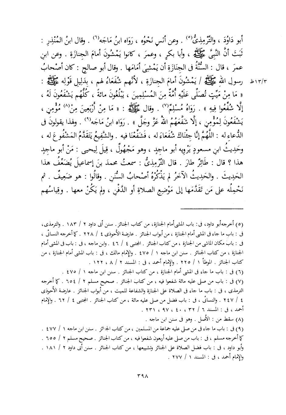 أبو دَاوُدَ، والتِّرْمِذِيُّ (٥). وعن أنَسٍ نَحْوُه، رَوَاه ابنُ مَاجَه (٦). وقال ابنُ المُنْذِرِ: ثَبَتَ أنَّ النَّبِيَّ -صلى اللَّه عليه وسلم-، وأبا بكرٍ، وعمرَ، كانوا يَمْشُونَ أمامَ الجِنازَةِ. وعن ابنِ عمرَ، قال: السُّنَّةُ في الجِنَازَةِ أن يَمْشِىَ أمَامَها. وقال أبو صالحٍ: كان أصْحابُ رسولِ اللهِ -صلى اللَّه عليه وسلم- يَمْشُونَ أمامَ الجِنازَةِ، لأنَّهم شُفَعَاءُ لهم، بِدَلِيلِ قَوْلِه -صلى اللَّه عليه وسلم-: "مَا مِنْ مَيِّتٍ تُصَلِّى عَلَيْهِ أُمَّةٌ مِنَ المُسْلِمِينَ، يَبْلُغُونَ مائةً، كُلُّهُم يَشْفَعُونَ لَهُ، إلَّا شُفِّعُوا فِيهِ". رَوَاهُ مُسْلِمٌ (٧). وقال -صلى اللَّه عليه وسلم-: "مَا مِنْ أَرْبَعِينَ مِنْ (٨) مُؤْمِنٍ، يَشْفَعُونَ لِمُؤْمِنٍ، إلَّا شَفَّعَهُمُ اللهُ عَزَّ وجَلَّ". رَوَاه ابنُ مَاجَه (٩). ولهذا يقولونَ في الدُّعاءِ له: اللَّهُمَّ إنَّا جِئْنَاكَ شُفَعَاءَ له، فَشَفِّعْنَا فيه. والشَّفِيعُ يَتَقَدَّمُ المَشْفُوعَ له، وحَدِيثُ ابنِ مسعودٍ يَرْوِيه أبو ماجدٍ، وهو مَجْهُولٌ، قِيلَ لِيحيى: مَنْ أبو ماجِدٍ هذا؟ قال: طَائِرٌ طارَ. قال التِّرْمِذِيُّ: سمعتُ محمدَ بنَ إسماعيلَ يُضَعِّفُ هذا الحَدِيثَ. والحَدِيثُ الآخَرُ لم يَذْكُرْهُ أصْحابُ السُّنَنِ. وقالُوا: هو ضَعِفٌ. ثم نَحْمِلُه على مَن تَقَدَّمَها إلى مَوْضِعِ الصلاةِ أو الدَّفْنِ، ولم يَكُنْ معها. وقِياسُهم