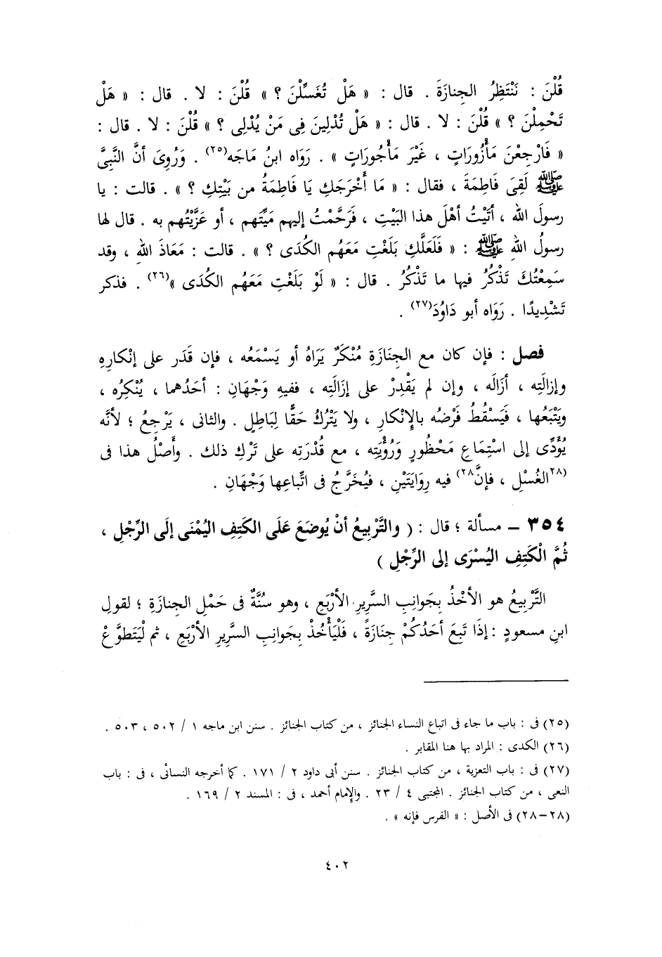 قُلْنَ: نَنْتَظِرُ الجِنازَةَ. قال: "هَلْ تُغَسِّلْنَ؟ " قُلْنَ: لا. قال: "هَلْ تَحْمِلْنَ؟ " قُلْنَ: لا. قال: "هَلْ تُدْلِينَ فِي مَنْ يُدْلِى؟ " قُلْنَ: لا. قال: "فَارْجِعْنَ مَأْزُورَاتٍ، غَيْرَ مَأْجُورَاتٍ". رَوَاه ابنُ مَاجَه (٢٥). وَرُوِىَ أنَّ النَّبِيَّ -صلى اللَّه عليه وسلم- لَقِىَ فَاطِمَةَ، فقال: "مَا أَخرَجَكِ يَا فَاطِمَةُ من بَيْتِكِ؟ ". قالت: يا رسولَ اللَّه، أتَيْتُ أهْلَ هذا البَيْتِ، فَرَحَّمْتُ إليهم مَيِّتَهم، أو عَزَّيْتُهم به. قال لها رسولُ اللهِ -صلى اللَّه عليه وسلم-: "فَلَعَلَّكِ بَلَغْتِ مَعَهُم الكُدَى؟ ". قالت: مَعَاذَ اللهِ، وقد سَمِعْتُكَ تَذْكُرُ فيها ما تَذْكُرُ. قال: "لَوْ بَلَغْتِ مَعَهُم الكُدَى" (٢٦). فذكر تَشْدِيدًا. رَوَاه أبو دَاوُدَ (٢٧).