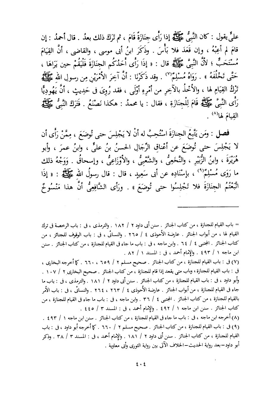 علىٍّ يقول: كان النَّبِيُّ -صلى اللَّه عليه وسلم- إذا رَأَى جِنَازَةً قَامَ، ثم تَرَكَ ذلك بعدُ. قال أحمدُ: إن قامَ لم أعِبْهُ، وإن قَعَدَ فلا بَأْسَ. وذَكَرَ ابنُ أبي موسى، والقاضى، أنَّ القِيَامَ مُسْتَحَبٌّ؛ لأنَّ النَّبِيَّ -صلى اللَّه عليه وسلم- قال: "إذَا رَأَى أَحَدُكُم الجِنَازَةَ فَلْيَقُمْ حين يَرَاهَا، حَتَّى تَخْلُفَهُ". رَوَاهُ مُسْلِمٌ (٧). وقد ذَكَرْنَا: أنَّ آخِرَ الأمْرَيْنِ مِن رسولِ اللهِ -صلى اللَّه عليه وسلم- تَرْكُ القِيَامِ لها، والأخْذُ بالآخِرِ من أمْرِهِ أوْلَى، فقد رُوِىَ في حَدِيثٍ، أنَّ يَهُودِيًّا رَأَى النَّبِيَّ -صلى اللَّه عليه وسلم- قَامَ لِلْجِنَازَةِ، فقال: يا محمدُ: هكذا نَصْنَعُ. فَتَرَكَ النَّبِيُّ -صلى اللَّه عليه وسلم- القِيامَ لها (٨).