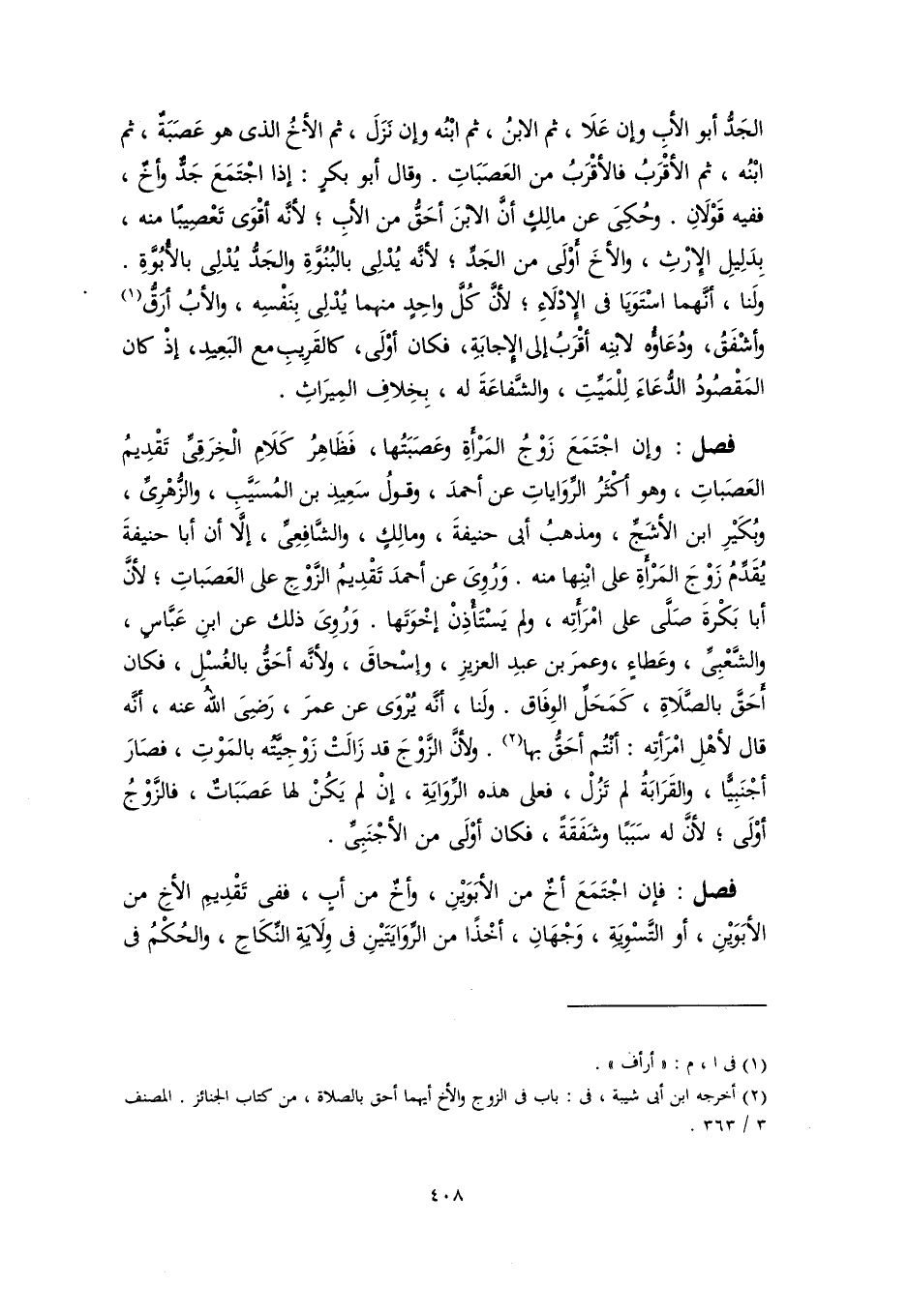 فصل: وإن اجْتَمَعَ زَوْجُ المَرْأَةِ وعَصبَتُها، فَظَاهِرُ كَلَامِ الْخِرَقِيِّ تَقْدِيمُ العَصَباتِ، وهو أكْثَرُ الرِّوَاياتِ عن أحمدَ، وقولُ سَعِيدِ بن المُسَيَّبِ، والزُّهْرِيِّ، وبُكَيْرِ ابن الأشَجِّ، ومذهبُ أبي حنيفةَ، ومالِكٍ، والشَّافِعِيُّ، إلَّا أن أبا حنيفةَ يُقَدِّمُ زَوْجَ المَرْأَةِ على ابْنِها منه. وَرُوِىَ عن أحمدَ تَقْدِيمُ الزَّوْجِ على العَصَباتِ؛ لأنَّ أبا بَكْرةَ صَلَّى على امْرَأَتِه، ولم يَسْتَأْذِنْ إخْوَتَها. وَرُوِىَ ذلك عن ابنِ عَبَّاسٍ، والشَّعْبِيِّ، وعَطاءٍ، وعمرَ بن عبدِ العزيزِ، وإسْحاقَ، ولأنَّه أحَقُّ بالغُسْلِ، فكان أَحَقَّ بالصَّلاةِ، كمَحَلِّ الوِفَاق. ولَنا، أنَّه يُرْوَى عن عمرَ، رَضِىَ اللهُ عنه، أنَّه قال لأهْلِ امْرَأتِه: أنْتُم أحَقُّ بها (٢). ولأنَّ الزَّوْجَ قد زَالَتْ زَوْجِيَّتُه بالمَوْتِ، فصَارَ أجْنَبِيًّا، والقَرَابَةُ لم تَزُلْ، فعلى هذه الرِّوَايَةِ، إنْ لم يَكُنْ لها عَصَبَاتٌ، فالزَّوْجُ أوْلَى؛ لأنَّ له سَبَبًا وشَفَقَةً، فكان أوْلَى من الأجْنَبِيِّ.
