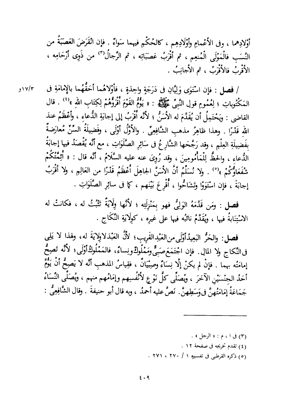 فصل: فإن اسْتَوَى وَلِيَّانِ في دَرَجَةٍ واحِدَةٍ، فأوْلاهُما أحَقُّهُما بالإِمامَةِ في المَكْتُوباتِ؛ لِعُمُومِ قولِ النَّبِيِّ -صلى اللَّه عليه وسلم-: "يَؤُمُ القَوْمَ أَقرَؤُهُمْ لِكِتَابِ اللهِ" (٤). قال القاضي: ويَحْتَمِلُ أن يُقَدَّمَ له الأسَنُّ؛ لأنَّه أَقْرَبُ إلى إجابَةِ الدُّعاءِ، وأعْظَمُ عندَ اللهِ قَدْرًا. وهذا ظاهِرُ مذهبِ الشَّافِعِيِّ. والأوَّلُ أوْلَى، وفَضِيلَةُ السِّنِّ مُعارَضةٌ بِفَضِيلَةِ العِلْمِ، وقد رَجَّحَها الشَّارِعُ في سَائِرِ الصَّلَوَاتِ، مع أنَّه يُقْصَدُ فيها إجابَةُ الدُّعاء، والحظُّ لِلْمَأْمُومِينَ، وقد رُوِىَ عنه عليه السَّلَامُ، أنَّه قال: "أَئِمَّتُكُمْ شُفَعَاؤُكُمْ" (٥). ولا نُسَلِّمُ أنَّ الأسَنَّ الجاهِلَ أَعْظَمُ قَدْرًا من العَالِمِ، ولا أقْرَبُ إجابَةً، فإن اسْتَوَوْا وتَشَاحُّوا، أُقْرِعَ بَيْنَهم، كما في سائِرِ الصَّلَوَاتِ.