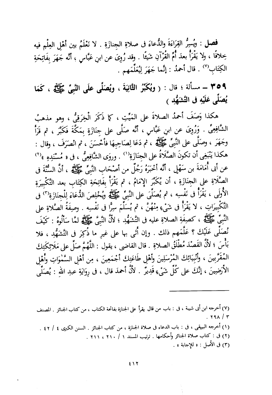 هكذا وَصَفَ أحمدُ الصلاةَ على المَيِّتِ، كما ذَكَرَ الْخِرَقِيُّ، وهو مذهبُ الشَّافِعِيِّ. وَرُوِىَ عن ابنِ عَبَّاسٍ، أنَّه صَلَّى على جِنَازَةٍ بِمَكَّةَ فَكَبَّر، ثم قَرَأَ وجَهَرَ، وصَلَّى على النَّبِيِّ -صلى اللَّه عليه وسلم-، ثم دَعَا لِصَاحِبِهَا فأحْسَنَ، ثم انْصَرَفَ، وقال: هكذا يَنْبَغِى أن تكونَ الصَّلَاةُ على الجِنَازَةِ (١). وروَى الشَّافِعِيُّ، في "مُسْنَدِهِ" (٢) عن أبي أُمَامَةَ بن سَهْلٍ، أنَّه أخْبَرَهُ رَجُلٌ من أصْحَابِ النَّبِيِّ -صلى اللَّه عليه وسلم-، أنَّ السُّنَّةَ في الصَّلَاةِ على الجِنَازَةِ، أن يُكَبِّرَ الإِمَامُ، ثم يَقْرَأَ بفَاتِحَةِ الكِتَابِ بعد التَّكْبِيرَةِ الأُولَى، يَقْرَأُ في نَفْسِه، ثم يُصَلِّىَ على النَّبِيِّ -صلى اللَّه عليه وسلم- وَيُخْلِصَ الدُّعَاءَ لِلْجِنَازَةِ (٣) في التَّكْبِيرَاتِ، لا يَقْرَأُ في شَىْءٍ مِنْهُنَّ، ثم يُسَلِّمَ سِرًّا في نَفْسِه. وصِفَةُ الصَّلاةِ على النَّبِيِّ -صلى اللَّه عليه وسلم-، كصِفَةِ الصلاةِ عليه في التَّشَهُّدِ؛ لأنَّ النَّبِيَّ -صلى اللَّه عليه وسلم- لمَّا سَألُوهُ: كَيْفَ نُصَلِّى عَلَيْكَ؟ عَلَّمَهم ذلك. وإن أَتَى بها على غيرِ ما ذُكِرَ في التَّشَهُّدِ، فلا بَأْسَ؛ لأنَّ القَصْدَ مُطْلَقُ الصلاةِ. قال القاضي، يقول: اللَّهُمَّ صَلِّ على مَلَائِكَتِكَ المُقَرَّبِينَ، وأنْبِيَائِكَ المُرْسَلِينَ وأهْلِ طَاعَتِكَ أجْمَعِينَ، مِن أهْلِ السَّموَاتِ وأَهْلِ الأرَضِينَ، إنَّكَ على كُلِّ شَىْءٍ قَدِيرٌ. لأنَّ أحمدَ قال، في رِوَايَةِ عبدِ اللهِ: يُصَلِّى