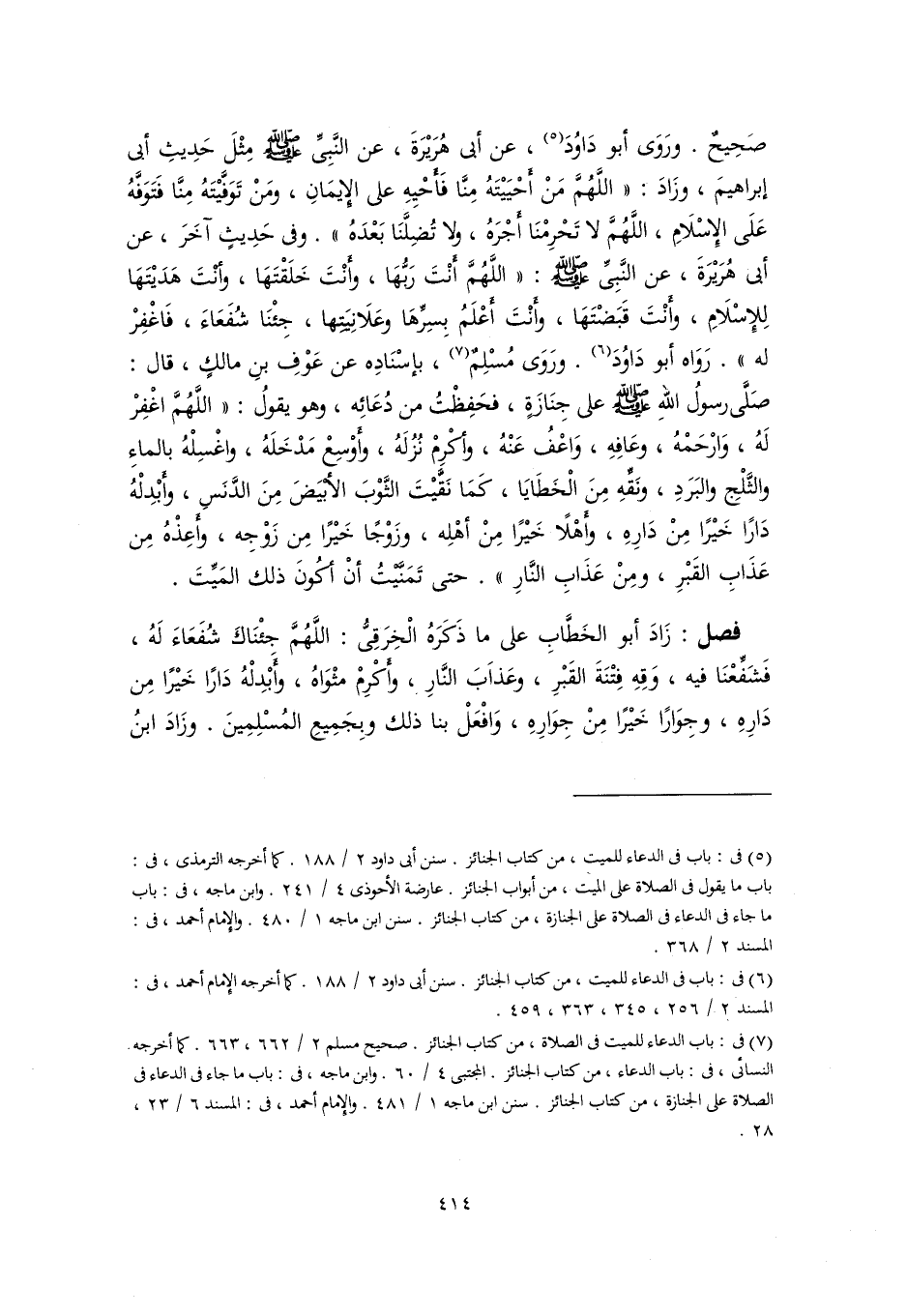 صَحِيحٌ. ورَوَى أبو دَاوُدَ (٥)، عن أبي هُرَيْرَةَ، عن النَّبِيِّ -صلى اللَّه عليه وسلم- مِثْلَ حَدِيثِ أبى إبراهيمَ، وزَادَ: "اللَّهُمَّ مَنْ أَحْيَيْتَهُ مِنَّا فَأَحْيِهِ على الإِيمَانِ، ومَنْ تَوَفَّيْتَهُ مِنَّا فَتَوَفَّهُ عَلَى الإِسْلَامِ، اللَّهُمَّ لا تَحْرِمْنَا أَجْرَهُ، ولا تُضِلَّنَا بَعْدَهُ". وفي حَدِيثٍ آخَرَ، عن أبي هُرَيْرَةَ، عن النَّبِيِّ -صلى اللَّه عليه وسلم-: "اللَّهُمَّ أَنْتَ رَبُّهَا، وأَنْتَ خَلَقْتَهَا، وأنْتَ هَدَيْتَهَا لِلإِسْلَامِ، وأَنْتَ قَبَضْتَهَا، وأَنْتَ أَعْلَمُ بِسِرِّهَا وعَلَانِيَتِها، جِئْنَا شُفَعَاءَ، فَاغْفِرْ له". رَوَاه أبو دَاوُدَ (٦). ورَوَى مُسْلِمٌ (٧)، بإسْنَادِه عن عَوْفِ بنِ مالكٍ، قال: صَلَّى رسولُ اللهِ -صلى اللَّه عليه وسلم- على جِنَازَةٍ، فحَفِظْتُ من دُعَائِه، وهو يقولُ: "اللَّهُمَّ اغْفِرْ لَهُ، وَارْحَمْهُ، وعَافِهِ، وَاعْفُ عَنْهُ، وأكْرِمْ نُزُلَهُ، وأَوْسِعْ مَدْخَلَهُ، واغْسِلْهُ بالماءِ والثَّلْجِ والبَرَدِ، ونَقِّهِ مِنَ الْخَطَايَا، كَمَا نَقَّيْتَ الثَّوْبَ الأبْيَضَ مِنَ الدَّنَسِ، وأَبْدِلْهُ دَارًا خَيْرًا مِنْ دَارِهِ، وأَهْلًا خَيْرًا مِنْ أهْلِه، وزَوْجًا خَيْرًا مِن زَوْجِه، وأَعِذْهُ مِن عَذَابِ القَبْرِ، ومِنْ عَذَابِ النَّارِ". حتى تَمَنَّيْتُ أنْ أكُونَ ذلك المَيِّتَ.