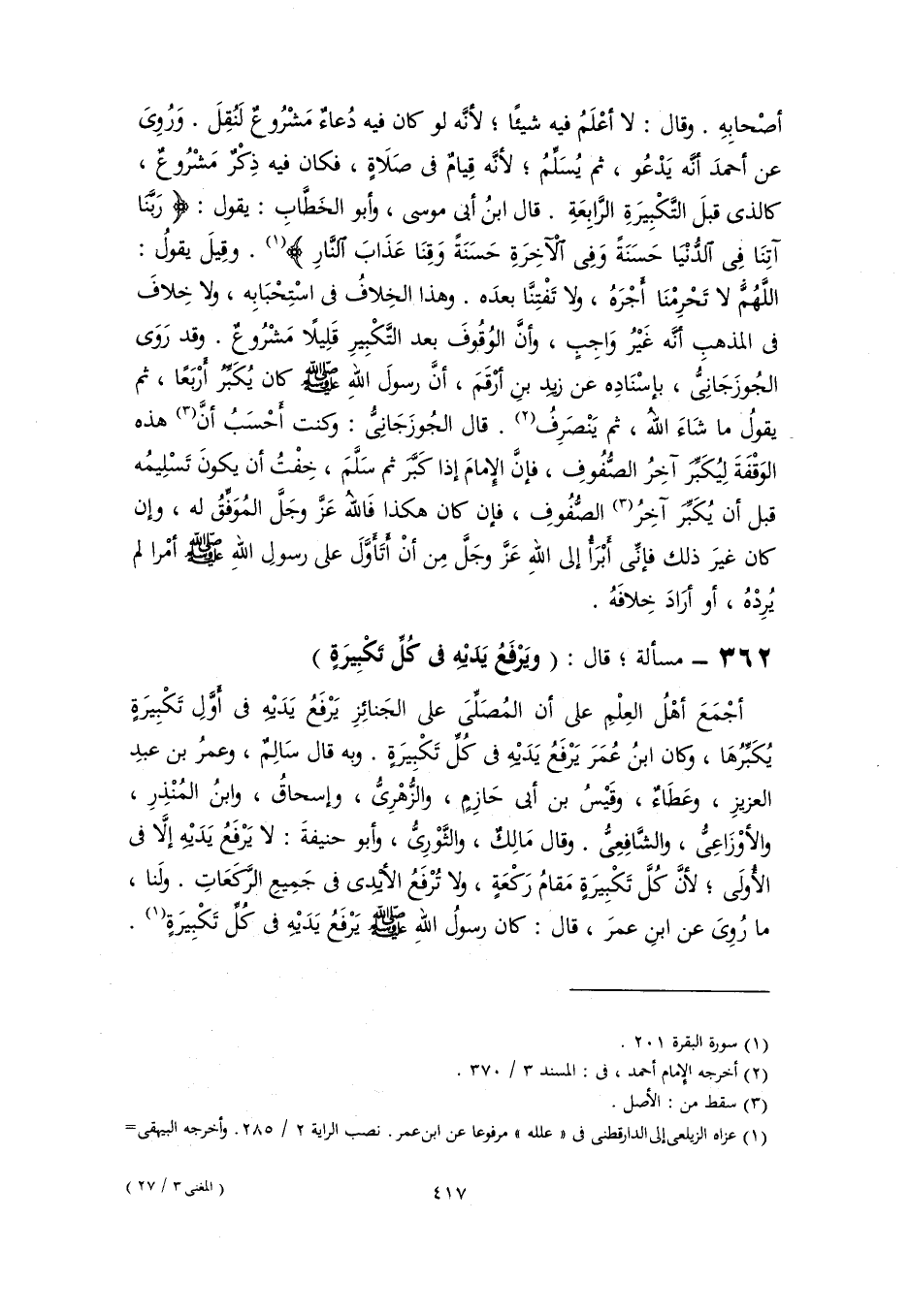 أصْحابِهِ. وقال: لا أعْلَمُ فيه شيئًا؛ لأنَّه لو كان فيه دُعاءٌ مَشْرُوعٌ لَنُقِلَ. وَرُوِىَ عن أحمدَ أنَّه يَدْعُو، ثم يُسَلِّمُ؛ لأنَّه قِيامٌ في صَلَاةٍ، فكان فيه ذِكْرٌ مَشْرُوعٌ، كالذى قبلَ التَّكْبِيرَةِ الرَّابِعَةِ. قال ابنُ أبي موسى، وأبو الخَطَّابِ: يقول: {رَبَّنَا آتِنَا فِي الدُّنْيَا حَسَنَةً وَفِي الْآخِرَةِ حَسَنَةً وَقِنَا عَذَابَ النَّارِ} (١). وقِيلَ يقولُ: اللَّهُمَّ لا تَحْرِمْنَا أَجْرَهُ، ولا تَفْتِنَّا بعدَه. وهذا الخِلافُ في اسْتِحْبَابِه، ولا خِلافَ في المذهبِ أنَّه غَيْرُ وَاجِبٍ، وأنَّ الوُقُوفَ بعد التَّكْبِيرِ قَلِيلًا مَشْرُوعٌ. وقد رَوَى الجُوزَجَانِيُّ، بإسْنَادِه عن زيدِ بنِ أرْقَمَ، أنَّ رسولَ اللهِ -صلى اللَّه عليه وسلم- كان يُكَبِّرُ أَرْبَعًا، ثم يقولُ ما شَاءَ اللهُ، ثم يَنْصَرِفُ (٢). قال الجُوزَجَانِيُّ: وكنت أَحْسَبُ أنَّ (٣) هذه الوَقْفَةَ لِيُكَبِّرَ آخِرُ الصُّفُوفِ، فإنَّ الإِمامَ إذا كَبَّرَ ثم سَلَّم، خِفْتُ أن يكونَ تَسْلِيمُه قبل أن يُكَبِّرَ آخِرُ (٣) الصُّفُوفِ، فإن كان هكذا فَاللهُ عَزَّ وجَلَّ المُوَفِّقُ له، وإن كان غيرَ ذلك فإنِّى أَبْرَأُ إلى اللهِ عَزَّ وجَلَّ مِن أنْ أَتَأَوَّلَ على رسولِ اللهِ -صلى اللَّه عليه وسلم- أمْرا لم يُرِدْهُ، أو أرَادَ خِلافَهُ.
