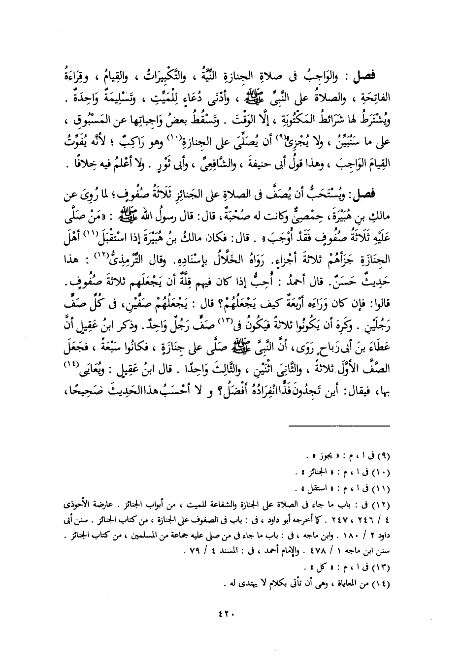 فصل: ويُسْتَحَبُّ أن يُصَفَّ في الصلاةِ على الجَنائِزِ ثَلَاثَهُ صُفُوفٍ؛ لما رُوِىَ عن مالكِ بنِ هُبَيْرَةَ، حِمْصِيٌّ وكانت له صُحْبَةٌ، قال: قال رسولُ اللَّه -صلى اللَّه عليه وسلم-: "مَنْ صَلَّى عَلَيْهِ ثَلَاثَةُ صُفُوفٍ فَقَدْ أَوْجَبَ". قال: فكان مالكُ بنُ هُبَيْرَةَ إذا اسْتقْبَلَ (١١) أهْلَ الجِنَازَةِ جَزَأهُمْ ثلاثةَ أجْزاءٍ. رَوَاهُ الخَلَّالُ بإسْنَادِهِ. وقال التِّرْمِذِيُّ (١٢): هذا حَدِيثٌ حَسَنٌ. قال أحمدُ: أُحِبُّ إذا كان فيهم قِلَّةٌ أن يَجْعَلَهم ثلاثةَ صُفُوفٍ. قالوا: فإن كان وَرَاءَه أرْبعَةٌ كيف يَجْعَلُهُمْ؟ قال: يَجْعَلُهُمْ صَفَّيْنِ، في كُلِّ صَفٍّ رَجُلَيْنِ. وكَرِهَ أن يَكُونُوا ثلاثةً فيَكُونُ في (١٣) صَفٍّ رَجُلٌ وَاحِدٌ. وذكر ابنُ عَقِيلٍ أنَّ عَطَاءَ بنَ أبي رَباحٍ رَوَى، أنَّ النَّبِيَّ -صلى اللَّه عليه وسلم- صَلَّى على جِنَازَةٍ، فكانُوا سَبْعَةً، فجَعَلَ الصَّفَّ الأوَّلَ ثلاثةً، والثَّانِىَ اثْنَيْنِ، والثَّالِثَ وَاحِدًا. قال ابنُ عَقِيلٍ: ويُعَايَى (١٤) بها، فيقال: أين تَجِدُونَ فَذًّا انْفِرَادُهُ أفْضَلُ؟ ولا أحْسَبُ هذا الحَدِيثَ صَحِيحًا،