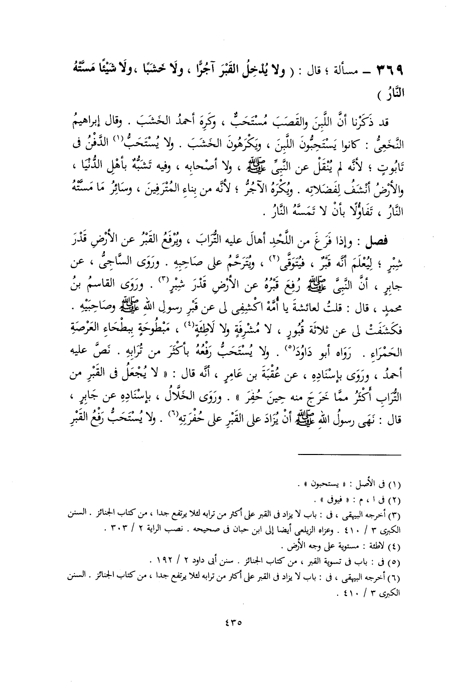 (٦) أخرجه البيهقي، في: باب لا يزاد في القبر على أكثر من ترابه لئلا يرتفع جدا، من كتاب الجنائز. السنن الكبرى ٣/ ٤١٠.