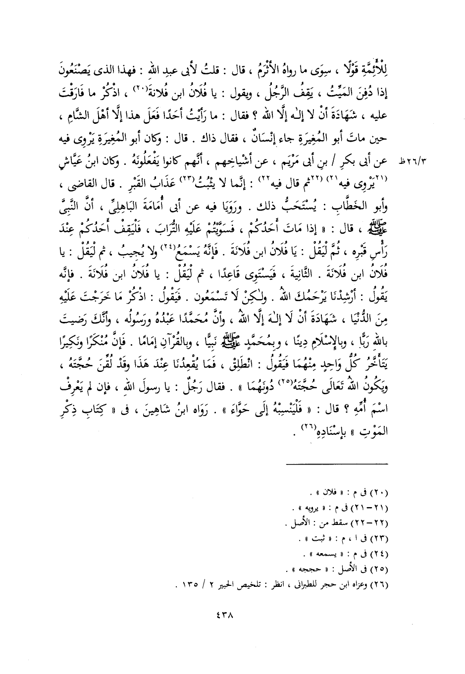 لِلْأَئِمَّةِ قَوْلًا، سِوَى ما رواهُ الأثْرَمُ، قال: قلتُ لأبي عبدِ اللهِ: فهذا الذي يَصْنَعُونَ إذا دُفِنَ المَيِّتُ، يَقِفُ الرَّجُلُ، ويقول: يا فُلَانُ ابن فُلانةَ (٢٠)، اذْكُرْ ما فَارَقْتَ عليه، شَهَادَةَ أنْ لا إله إلَّا اللَّه؟ فقال: ما رَأيْتُ أحَدًا فَعَلَ هذا إلَّا أهْلَ الشَّامِ، حين ماتَ أبو المُغِيرَةِ جاء إنْسَانٌ، فقال ذاك. قال: وكان أبو المُغِيرَةِ يَرْوِى فيه عن أبي بكرِ بنِ أبي مَرْيَم، عن أشْياخِهم، أنَّهم كانوا يَفْعَلُونَهُ. وكان ابنُ عَيَّاشٍ [يَرْوِى فيه] (٢١) [ثم قال فيه] (٢٢): إنَّما لا يثْبُتُ (٢٣) عَذَابُ القَبْرِ. قال القاضي، وأبو الخَطَّابِ: يُسْتَحَبُّ ذلك. ورَوَيَا فيه عن أبي أُمَامَةَ البَاهِلِىِّ، أنَّ النَّبِىَّ -صلى اللَّه عليه وسلم-، قال: "إذا مَاتَ أحَدُكُمْ، فَسَوَّيْتُمْ عَلَيْهِ التُّرَابَ، فَلْيَقِفْ أَحَدُكُمْ عِنْدَ رَأْسِ قَبْرِه، ثُمَّ لْيَقُلْ: يَا فُلَانُ ابن فُلَانَةَ. فَإنَّهُ يَسْمَعُ (٢٤) ولا يُجِيبُ، ثم لْيَقُلْ: يا فُلَانُ ابن فُلَانَةَ. الثَّانِيةَ، فَيَسْتَوِى قَاعِدًا، ثم لْيَقُلْ: يا فُلَانُ ابن فُلَانَةَ. فإنَّه يَقُولُ: أرْشِدْنَا يَرْحَمُكَ اللهُ. ولكِنْ لَا تَسْمَعُون. فَيَقْولُ: اذْكُرْ مَا خَرَجْتَ عَلَيْهِ مِنَ الدُّنْيَا، شَهَادَةَ أنْ لَا إلهَ إلَّا اللهُ، وأنَّ مُحَمَّدًا عَبْدُهُ ورَسُولُه، وأنَّكَ رَضيتَ باللهِ رَبًّا، وبالإِسْلَامِ دِينًا، وبِمُحَمَّدٍ -صلى اللَّه عليه وسلم- نَبِيًّا، وبالقُرْآنِ إمَامًا. فَإنَّ مُنْكَرًا ونَكِيرًا يَتَأَخَّرُ كُلُّ وَاحِدٍ مِنْهُمَا فَيَقُولُ: انْطَلِقْ، فَمَا يُقْعِدُنَا عِنْدَ هَذَا وقَدْ لُقِّنَ حُجَّتَهُ، ويَكُونُ اللهُ تَعَالَى حُجَّتَهُ (٢٥) دُونَهُمَا". فقال رَجُلٌ: يا رسولَ اللهِ، فإن لم يَعْرِفْ اسْمَ أُمِّهِ؟ قال: "فَلْيَنْسِبْهُ إلَى حَوَّاءَ". رَوَاه ابنُ شَاهِينَ، في "كِتَابِ ذِكْرِ المَوْتِ" بإسْنَادِهِ (٢٦).
