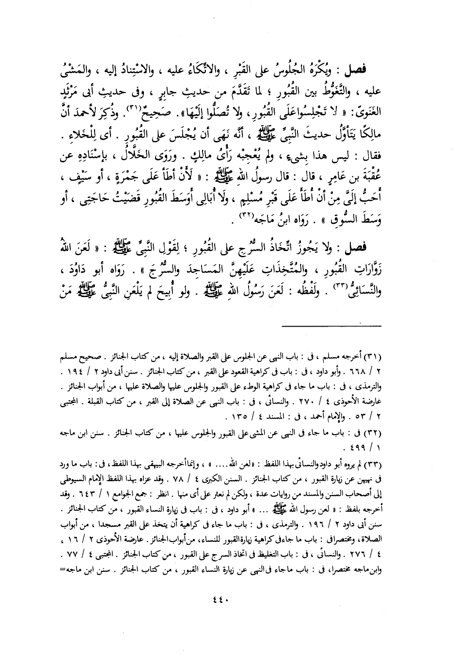 فصل: ولا يَجُوزُ اتِّخَاذُ السُّرُجِ على القُبُورِ؛ لِقَوْلِ النَّبِيِّ -صلى اللَّه عليه وسلم-: "لَعَنَ اللهُ زَوَّارَاتِ القُبُورِ، والمُتَّخِذَاتِ عَلَيْهِنَّ المَسَاجِدَ والسُّرُجَ". رَوَاه أبو دَاوُدَ، والنَّسَائِىُّ (٣٣). ولَفْظُه: لَعَنَ رَسُولُ اللهِ -صلى اللَّه عليه وسلم-. ولو أُبِيحَ لم يَلْعَنِ النَّبِىُّ -صلى اللَّه عليه وسلم- مَنْ