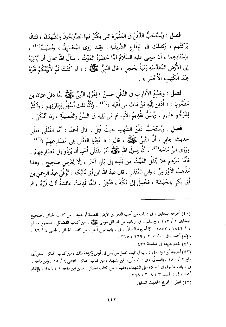 (٤٢) أخرجه أبو داود، في: باب في الميت يحمل من أرض إلى أرض وكراهة ذلك، من كتاب الجنائز. سنن أبي داود ٢/ ١٨٠. والنسائي، في: باب أين يدفن الشهيد، من كتاب الجنائز. المجتبى ٤/ ٦٥. وابن ماجه، في: باب ما جاء في الصلاة على الشهداء ودفنهم، من كتاب الجنائز. سنن ابن ماجه ١/ ٤٨٦. والإِمام أحمد، في: المسند ٣/ ٣٠٨، ٣٩٨.